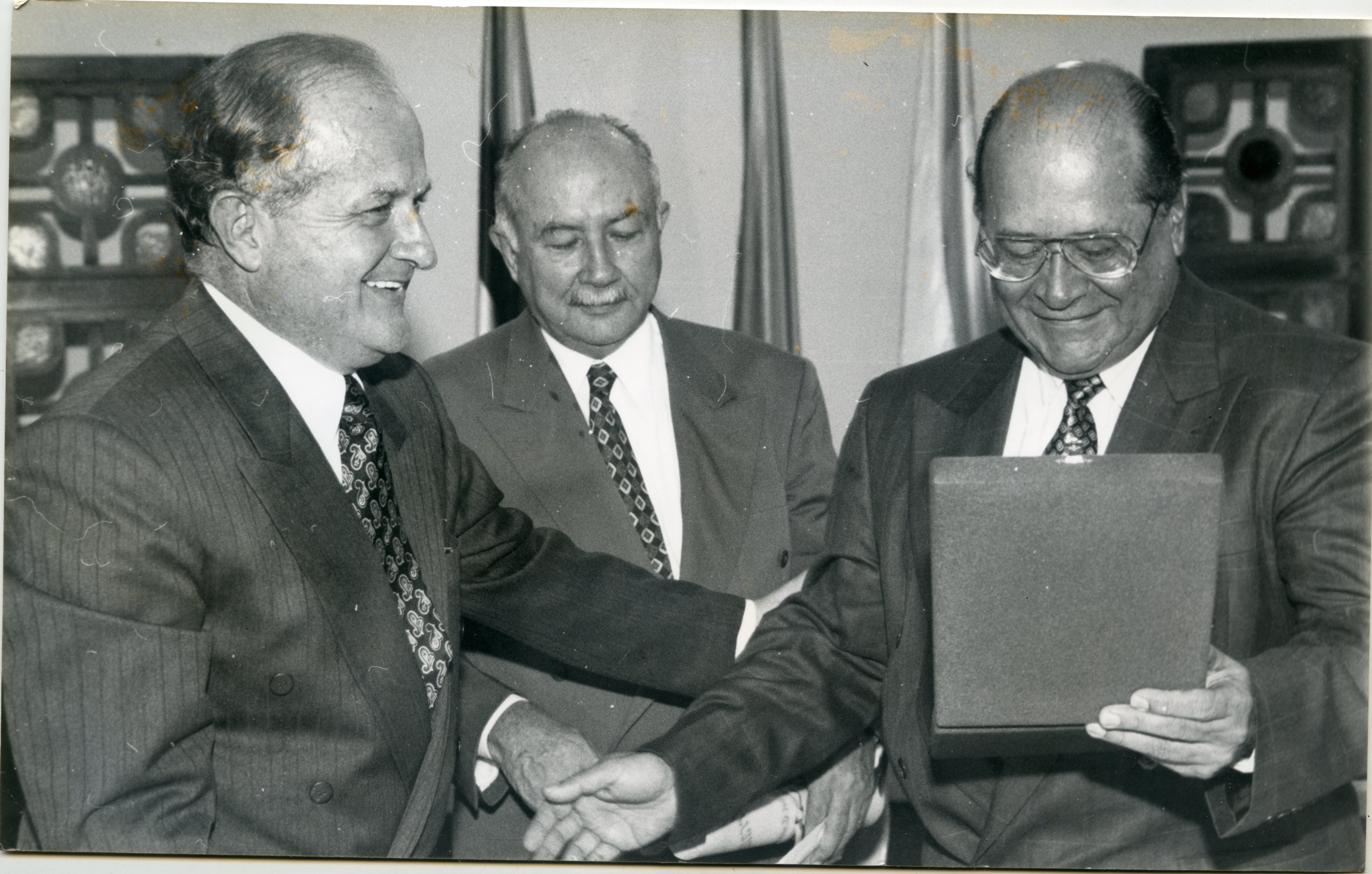 Al reverso de la fotografía se anexa recorte: "La administración del Valle, que dirige el gobernador Germán Villegas exaltó a dirigentes del sector solidario, el acto donde también condecoró al compositor y dirigente cívico Volney Naranjo (Izquierda)