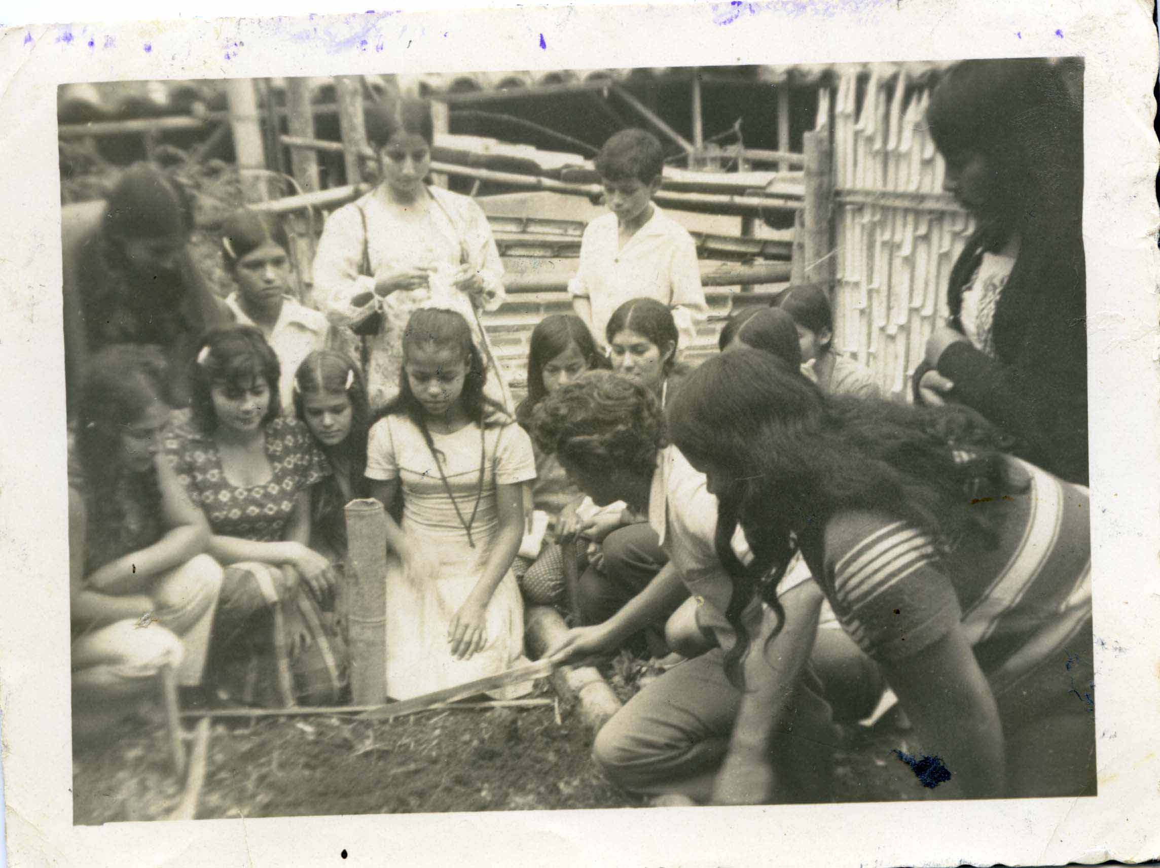 Argelia, Valle del Cauca. Fundado en 1904, por Manuel Mejía, José Antonio Murillo, Epifanio Chávez y Justiano Hincapié. Municipio desde 1956. En la foto aparece el profesor José Domingo Zúñiga, enseñando a hacer huertas
