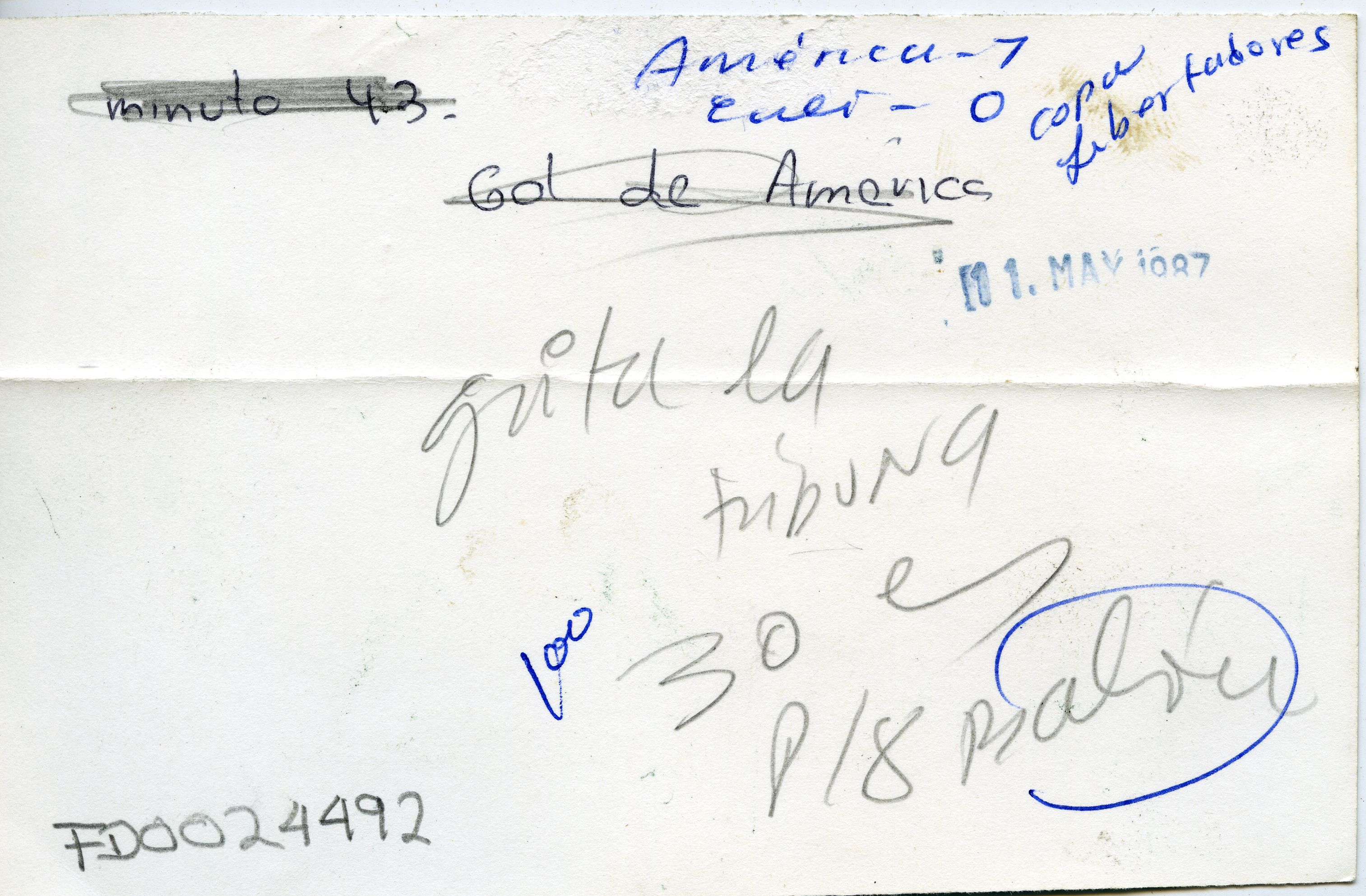 Partido de fútbol entre los equipos América y Deportivo Cali jugado en el estadio Pascual Guerrero. El partido terminó a favor del América de Cali 1-0. Se aprecia gol del América y lo grita la hinchada. Observamos público en la tribuna
