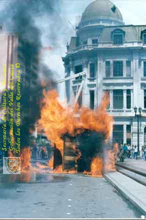 Bomberos apagando un incendio, en la Plaza Caicedo. Cali. C.1986.