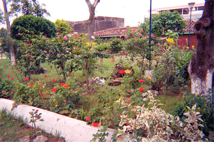 Plano general. Jardín con vegetación ornamental en parque de barrio. Al fondo se observan edificaciones. Exterior día.