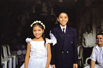 Primer Plano. Imagen donde se aprecia una pareja de niños en la celebración de la primera comunión. Al fondo un salón oscuro y algunas personas sentadas.