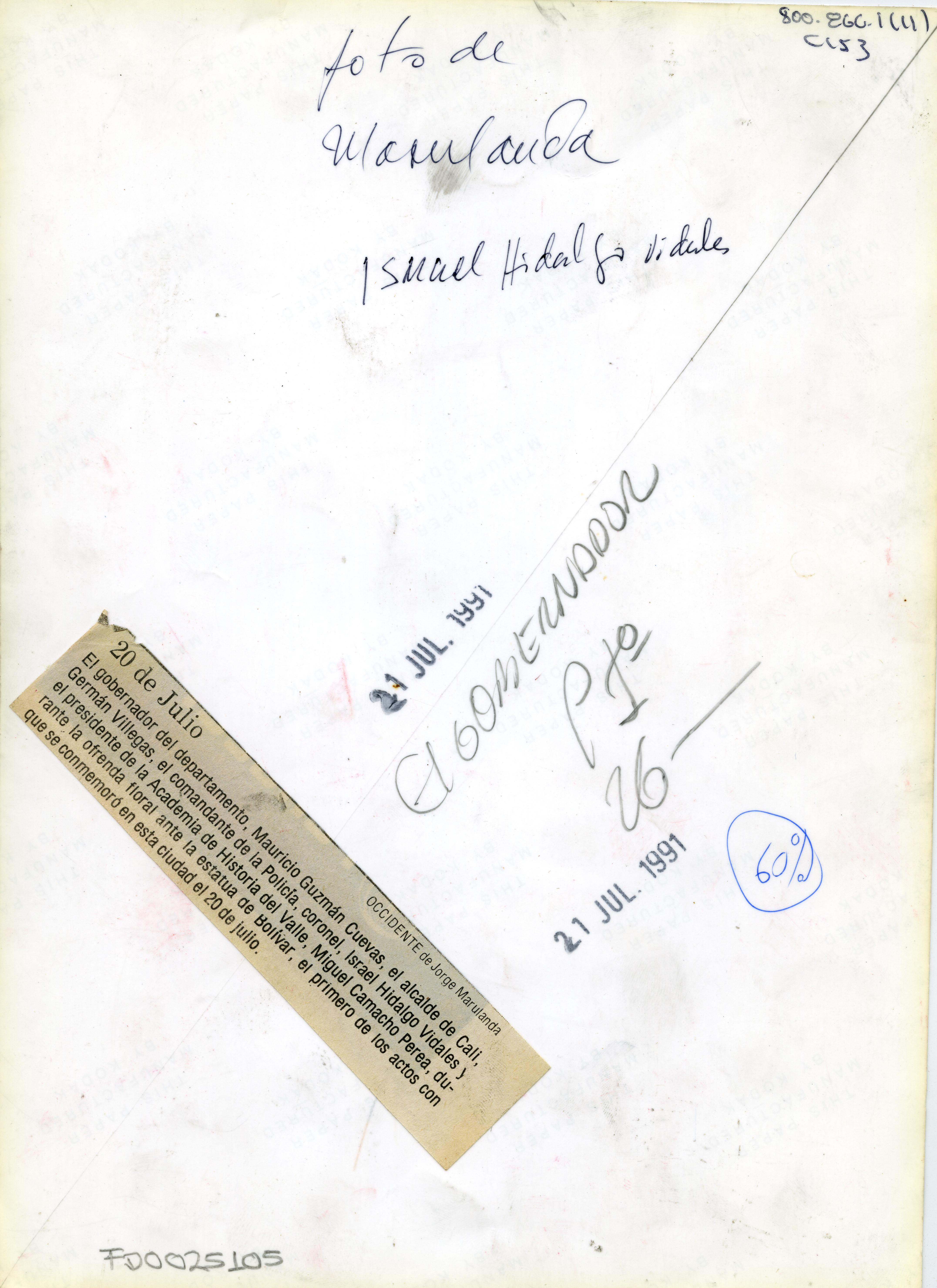 El gobernador del departamento, Mauricio Guzmán Cuevas, el alcalde de Cali, Germán Villegas, el comandante de la Policía coronel, Israel Hidalgos Vidales y el presidente de la Academia del Valle, Miguel Camacho Perea, durante la ofrenda floral ante la estatua de Bolívar, el primero de los actos el primero de los actos con que se conmemoró en esta ciudad el 20 de julio