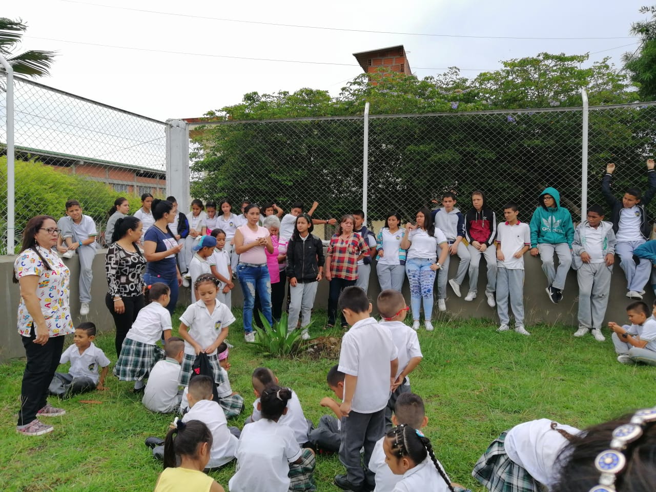 Se aprecia Amanda Gómez en institución educativa en compañía de niños y jovenes en el programa de identidad cultural "El fique estilo de vida"