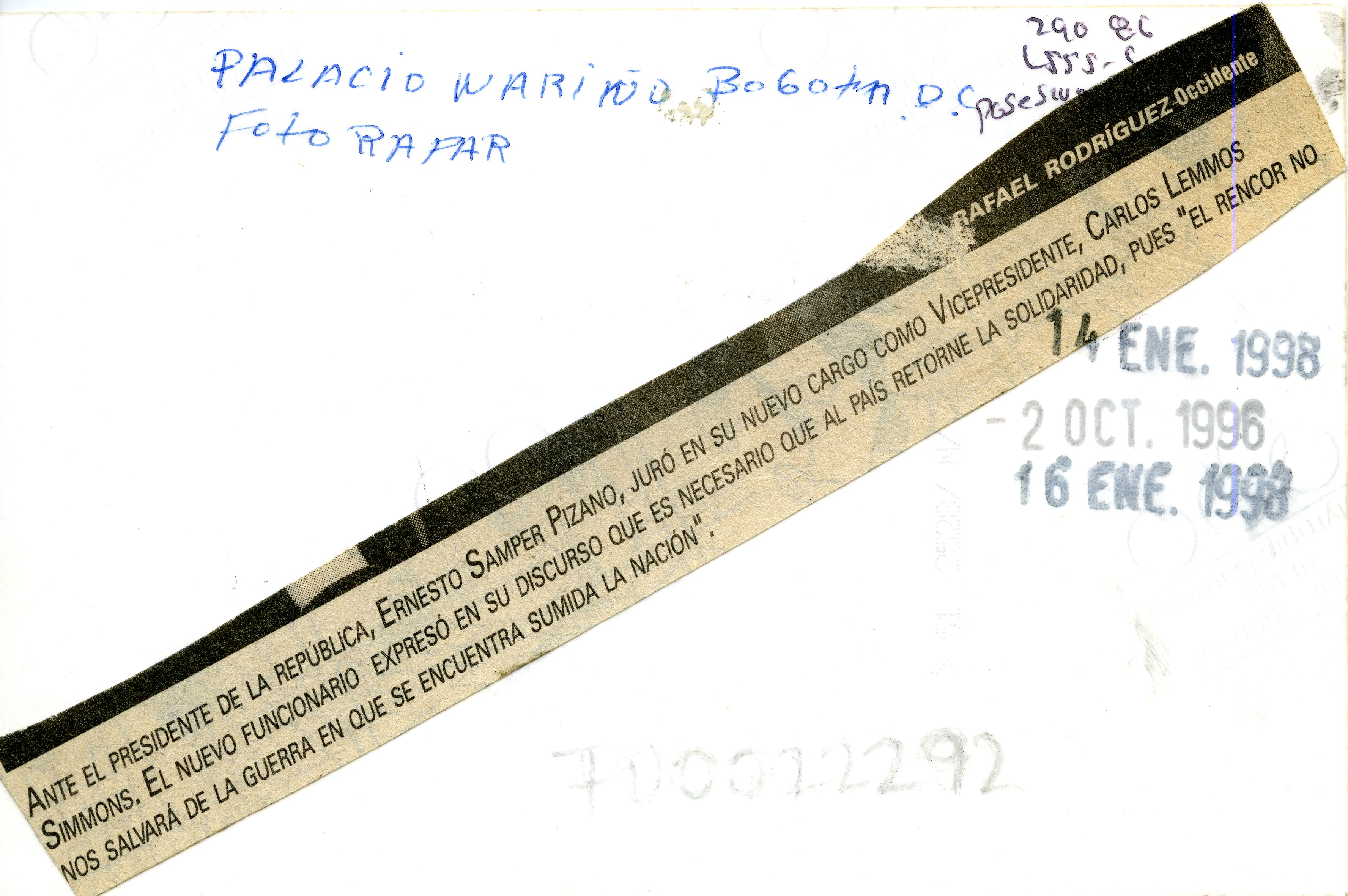 En la fotografía podemos apreciar la ceremonía en la que, ante el presidente Ernesto Samper, tomó posesión de su nuevo cargo como vicepresidente el señor Carlos Lemos Simmonds. Al reverso de la fotografía se anexa recorte: "Ante el presidente de la República, Ernesto Samper Pizano, juró en su nuevo cargo como vicepresidente, Carlos Lemos Simmons. El nuevo funcionario expresó en su discurso que es necesario que al país retorne la solidaridad, pues "el rencor no nos salvará de la guerra en que se encuentra sumida la nación".”