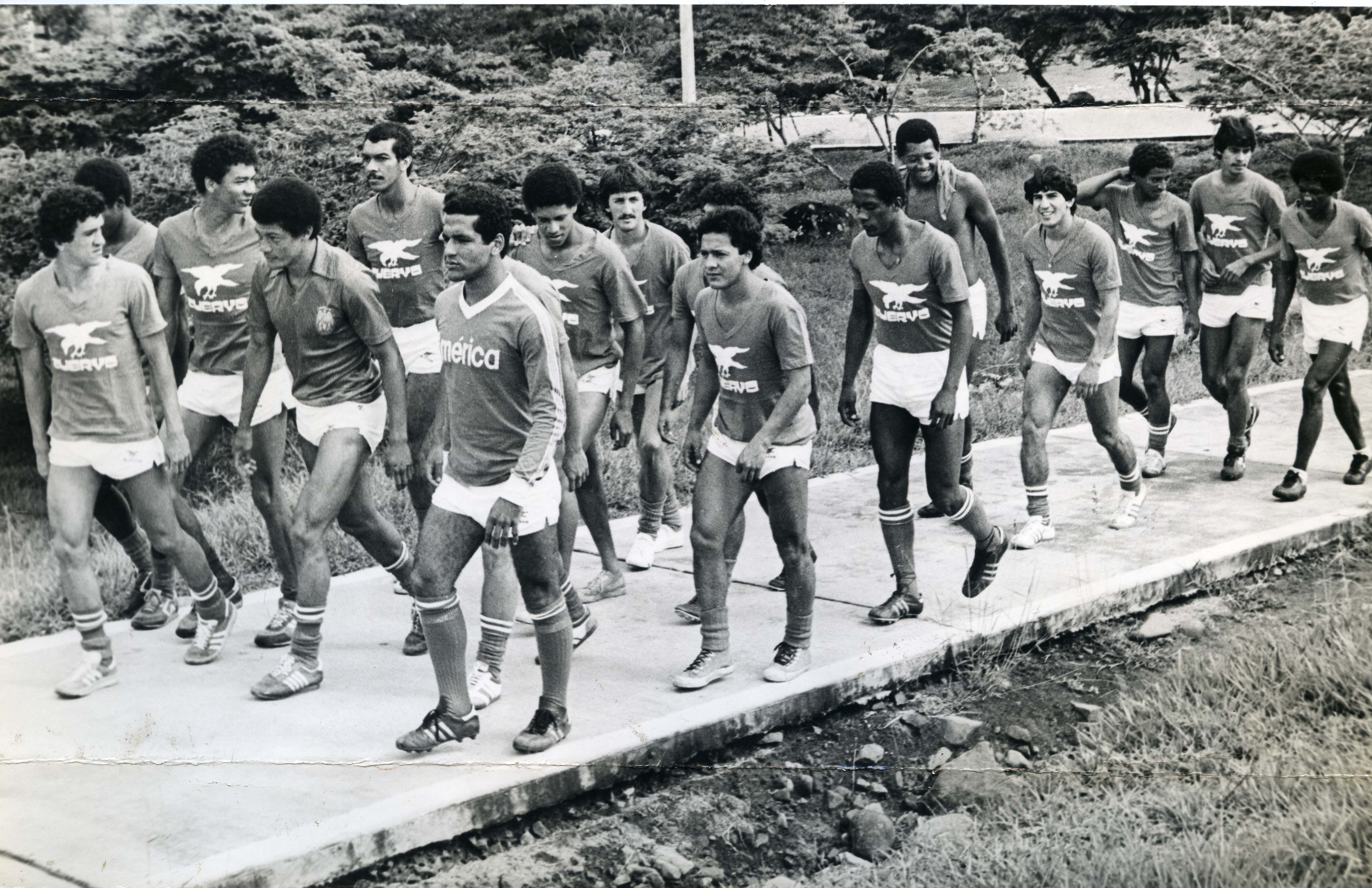 En el pie de foto dice lo siguiente: Todo el plantel completo de América de Cali, entrenando en la sede de cascajal. Observamos los jugadores caminando