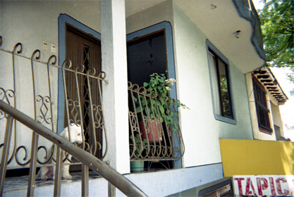 Fachada de la residencia del autor. Un perro en el balcón. Toma diagonal. Plano medio.