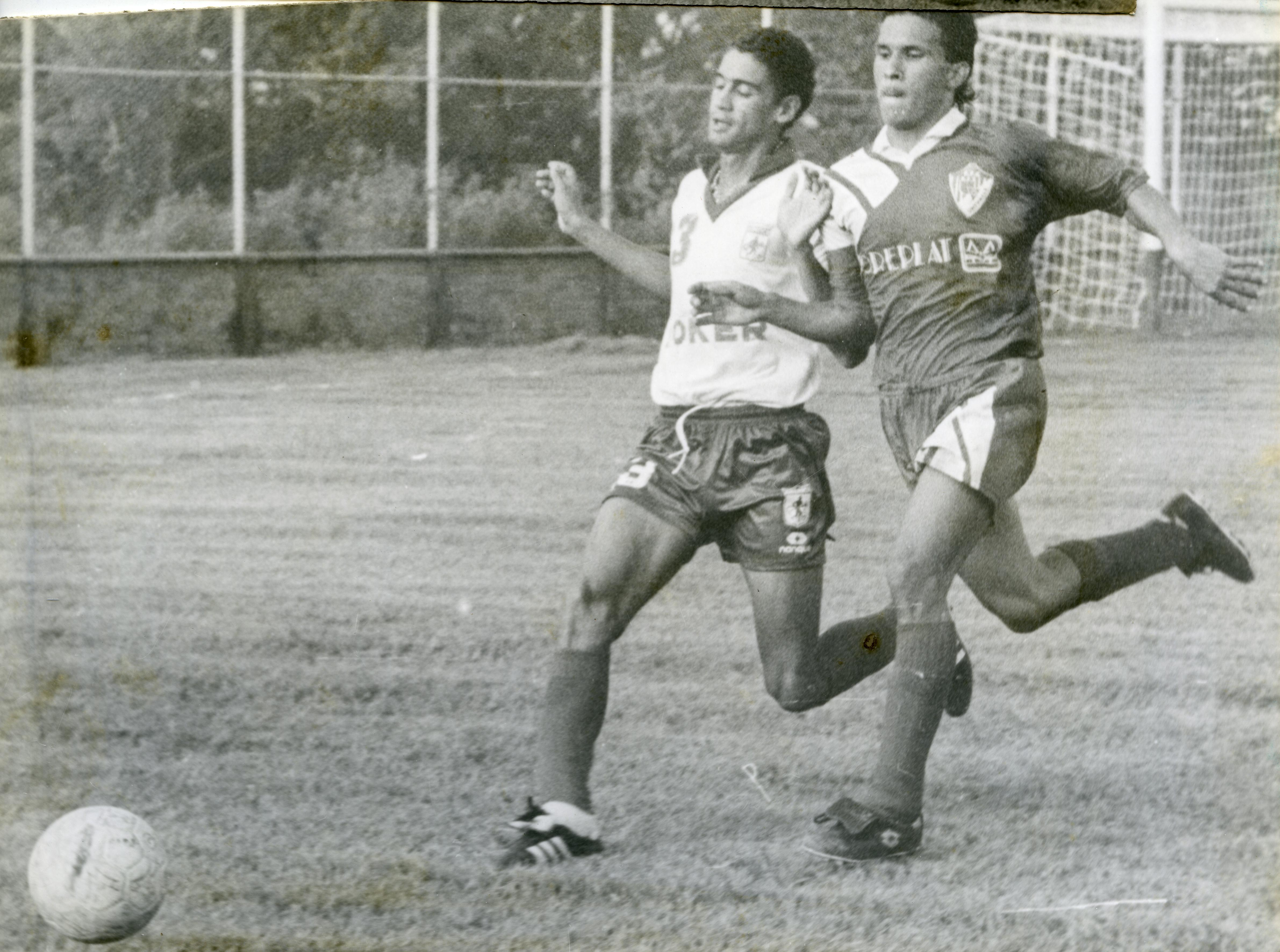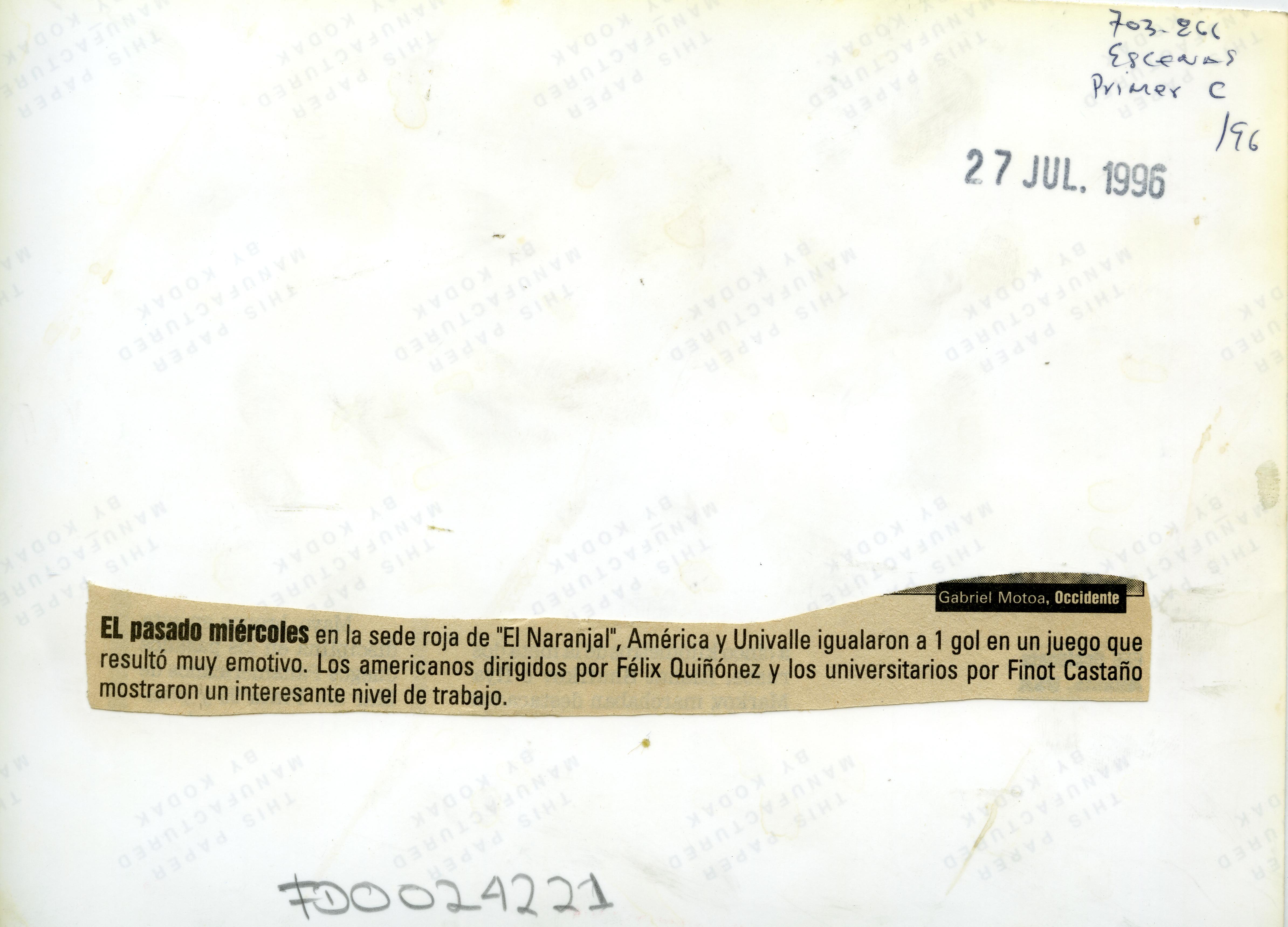 Al reverso de la fotografía se anexa recorte: El pasado miércoles en la sede roja de "El Naranjal", América y Univalle igualaron a un gol en un juego que resulto muy emotivo. Los americanos dirigidos por Félix Quinóñez y los universitarios por Finot Castaño mostraron un interesante nivel de trabajo