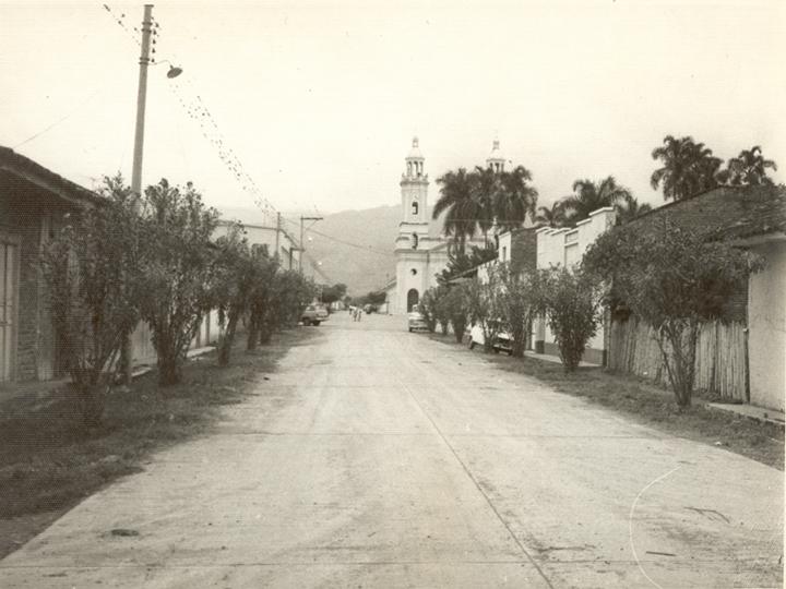Calle del municipio de Ginebra. Al fondo se observa el templo principal. Ginebra, fecha aproximada, 1980.