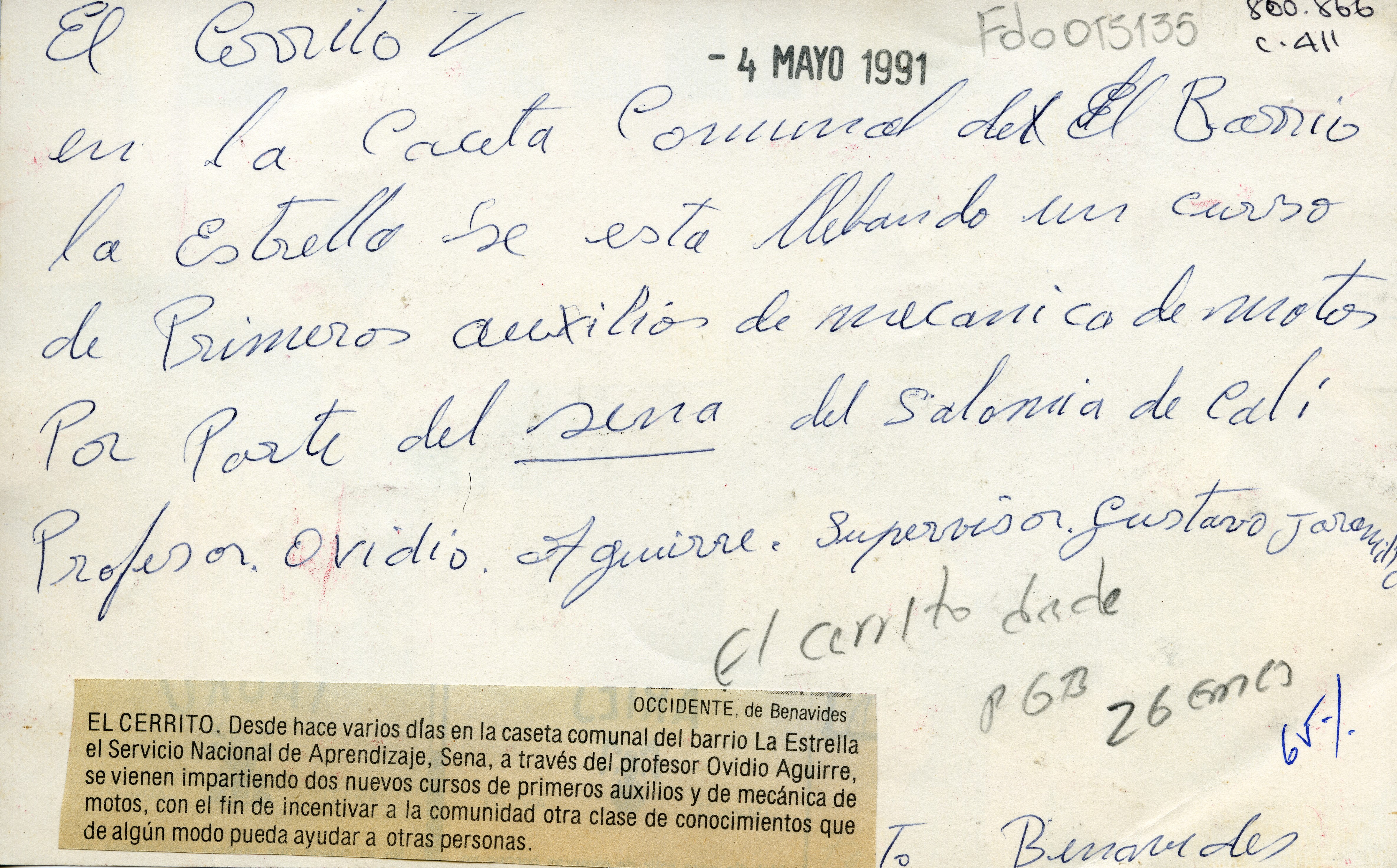 Estudiantes en talleres espacio adecuado en la caseta comunal. Observamos instructor en clases. Al reverso de la fotografía se anexa el pie de foto del periódico: "El Cerrito. Desde hace vario días en la caseta comunal del barrio La Estrella el Servicio Nacional de Aprendizaje, Sena, a través del profesor Ovidio Aguirre, se vienen impartiendo dos nuevos cursos de primeros auxilios y de mecánica de motos, con el fin de incentivar a la comunidad otra clase de conocimientos que de algún modo pueda ayudar a otras personas".