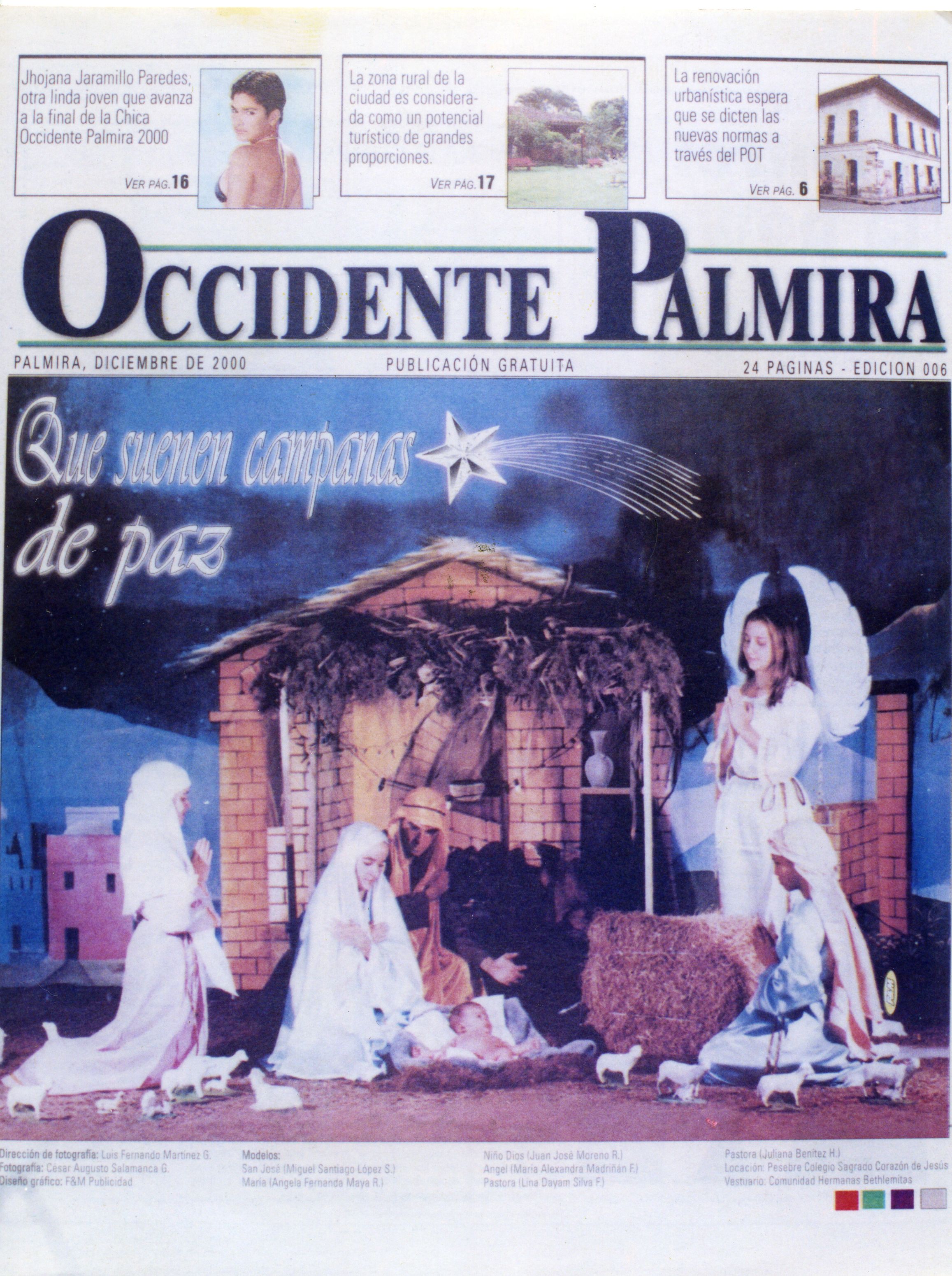 Fotografia de de plano completo de la portada del periodico diario de occidente, donde se aprecia un escrito " Occidente Palmira", en la parte inferior se puede ver una imagen navideña y un mensaje de paz