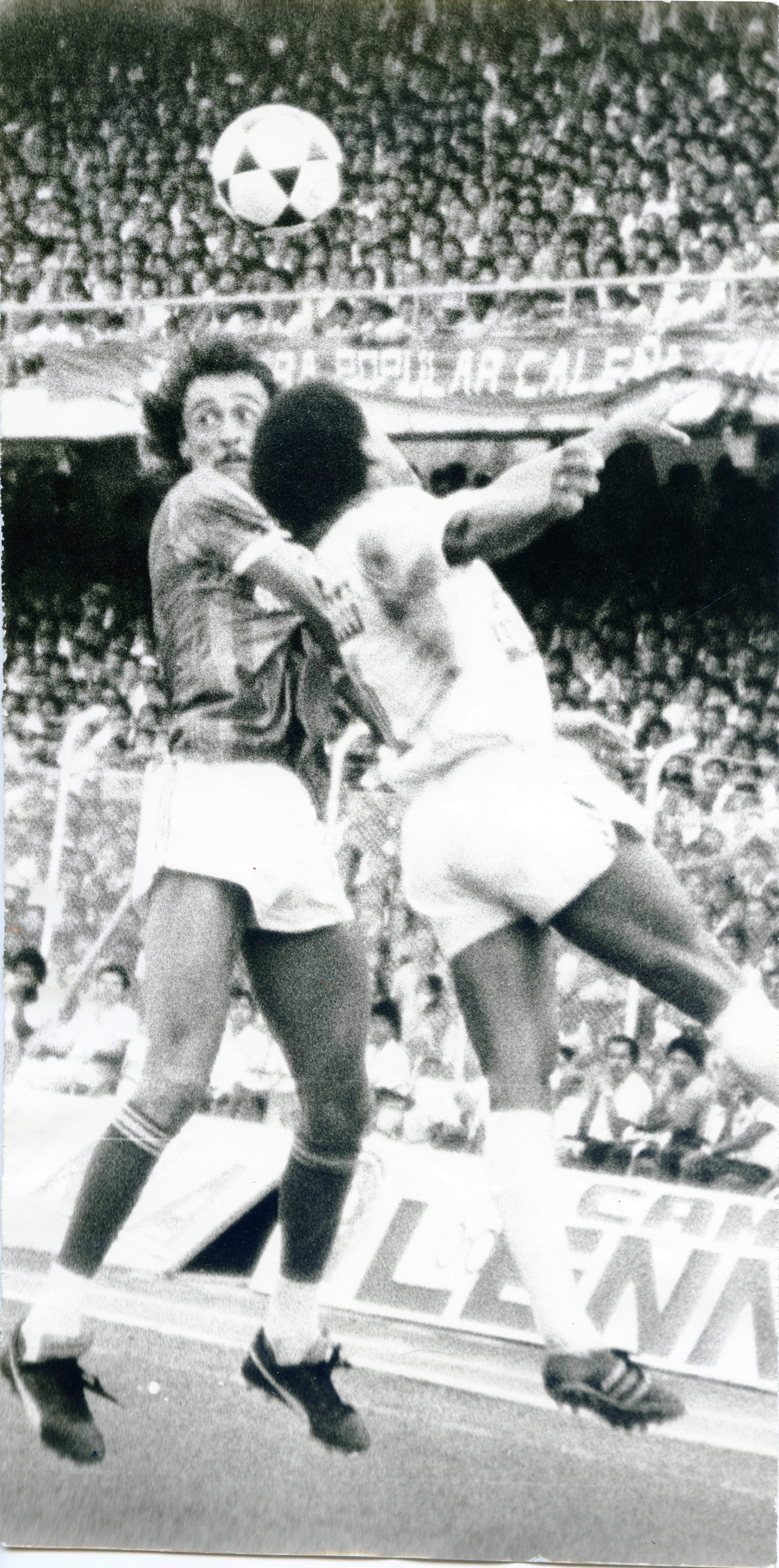Disputa de balón aéreo de Carlos Mario Hoyos jugador del Deportivo Cali, al fondo la tribuna llena.