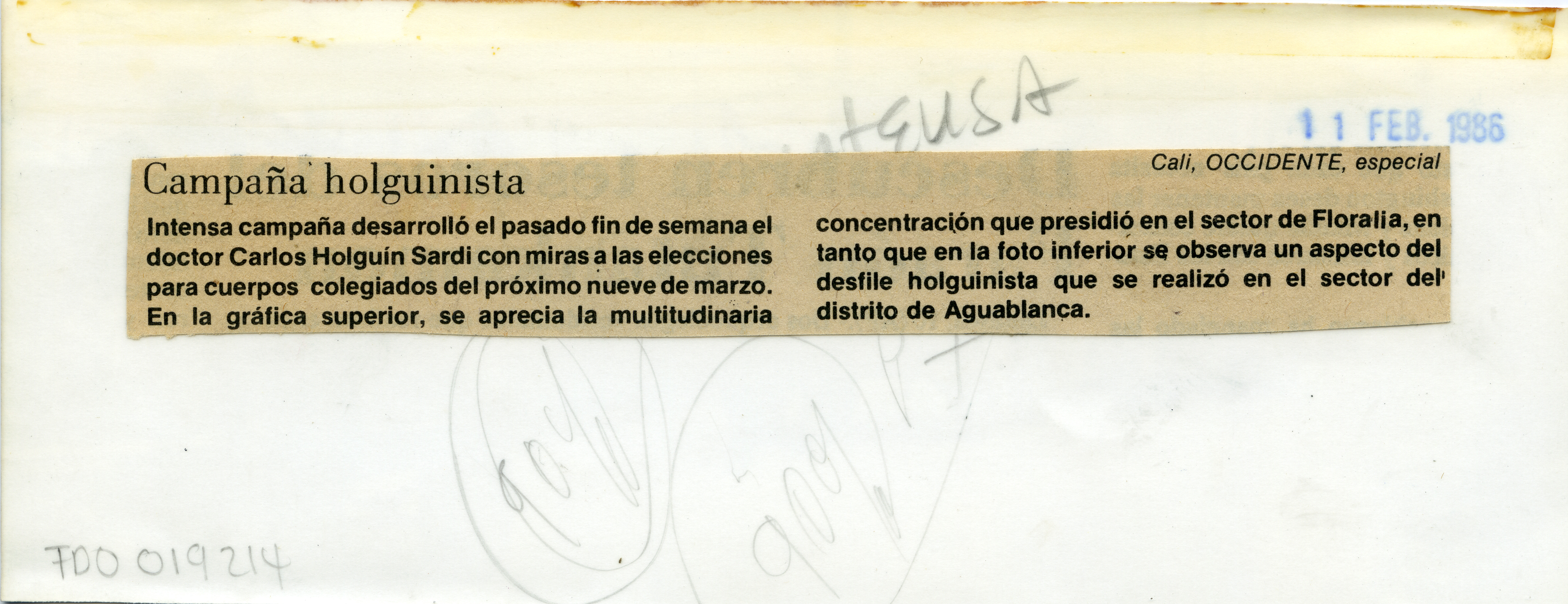 En el registro fotográfico podemos observar un desfile realizado en el distrito de Aguablanca, en apoyo a la campaña para las elecciones de Cuerpos colegiados de Carlos Holguín Sardi. Al reverso de la fotografía se anexa recorte: "Campaña holguinista. Intensa campaña desarrolló el pasado fin de semana el doctor Carlos Holguín Sardi con miras a las elecciones para cuerpos colegiado del próximo nueve de marzo. En la gráfica superior, se aprecia la multitudinaria concentración que presidió en el sector de Floralia, en tanto que la foto inferior se observa un aspecto del desfile holguinista que se realizó en el sector del distrito de Aguablanca."