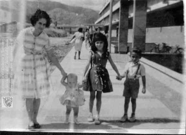 Beatriz Mejía con los niños María Elena Mejía, Ximena y Fredy Ramírez, caminando por el Seguro Social Rafael Uribe Uribe. Cali. 1963.