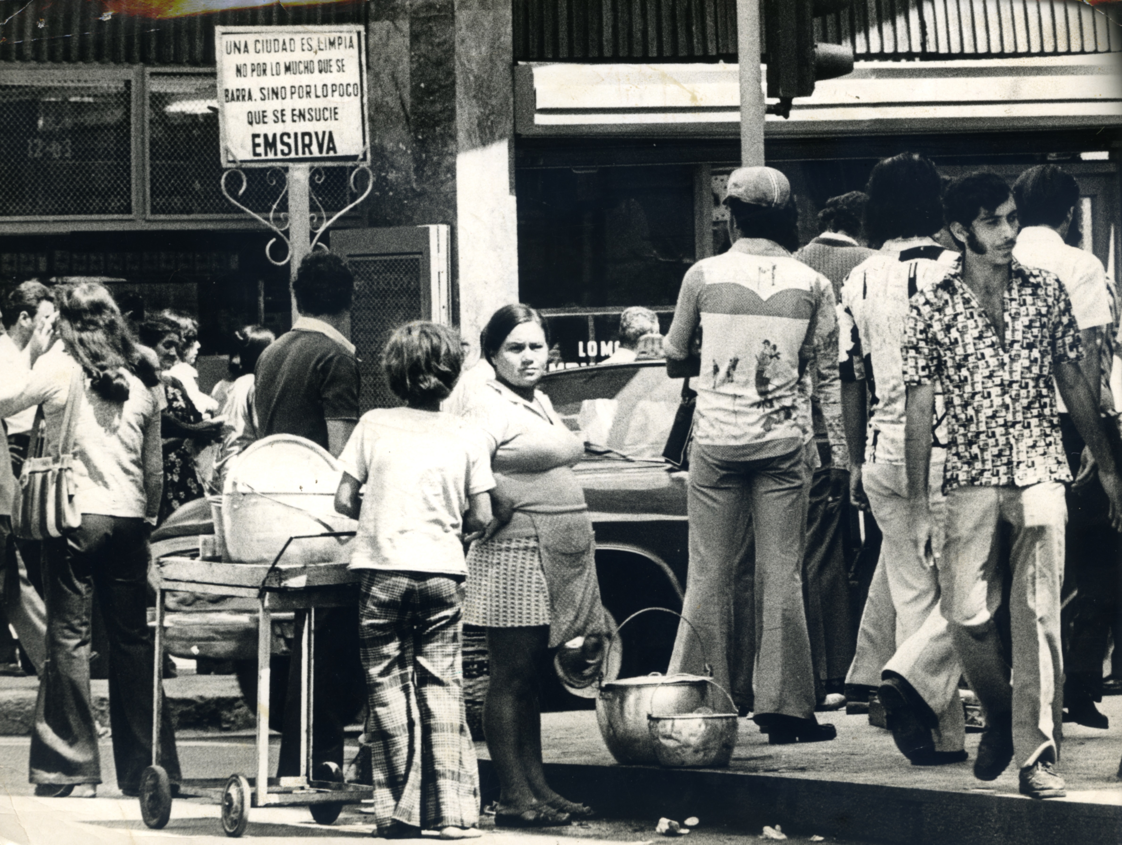 Vendedores ambulantes y transeúntes a las afueras del antiguo Palacio Nacional, ubicado en la Calle 12, entre Carrera 4a y 5a #12 - 04. Al fondo una nota de Emsirva: " Una ciudad es limpia no por lo mucho que se limpie, sino por lo poco que se ensucie."