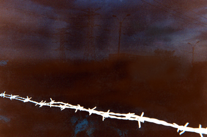 Plano medio. Toma realizada en exterior noche, se aprecia en el extremo inferior de la imagen una línea diagonal de alambre de púas sobre el cual se refleja la luz del flash.