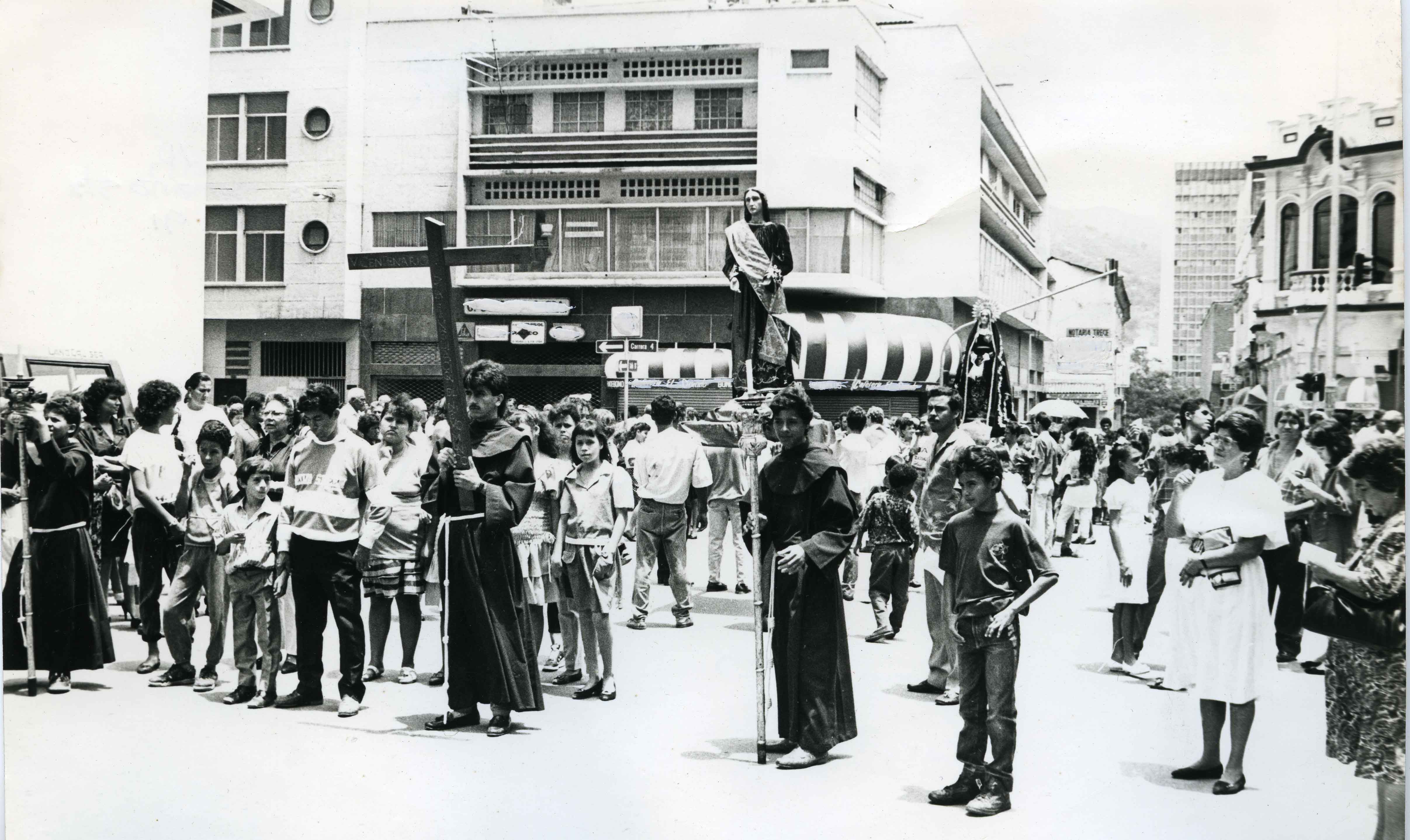 Tradicional Viacrucis en la Plazoleta de San Francisco en Santiago de Cali >El Archivo del Patrimonio Fotográfico y Fílmico del Valle del Cauca es responsabilidad de la Biblioteca Departamental del Valle Jorge Garcés Borrero, por convenio de cooperación suscrito con la Secretaria del Cultura Departamental, con el fin de aunar esfuerzos para su conservación, preservación y divulgación del Archivo entre la comunidad Vallecaucana, especialmente entre los estudiantes e investigadores que visitan la Biblioteca, propiciando el su uso y consulta permanente. La universidad Icesi es un colaborador en el proceso de difusión, facilitando la tecnología que permite la consulta de las imágenes.