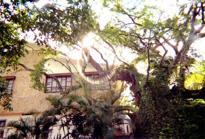 Plano medio. Costado derecho de casa. Ramaje de árbol sobrepuesto. Destaca textura rocosa de casa. Aura generada por enfoque frontal hacia el sol.