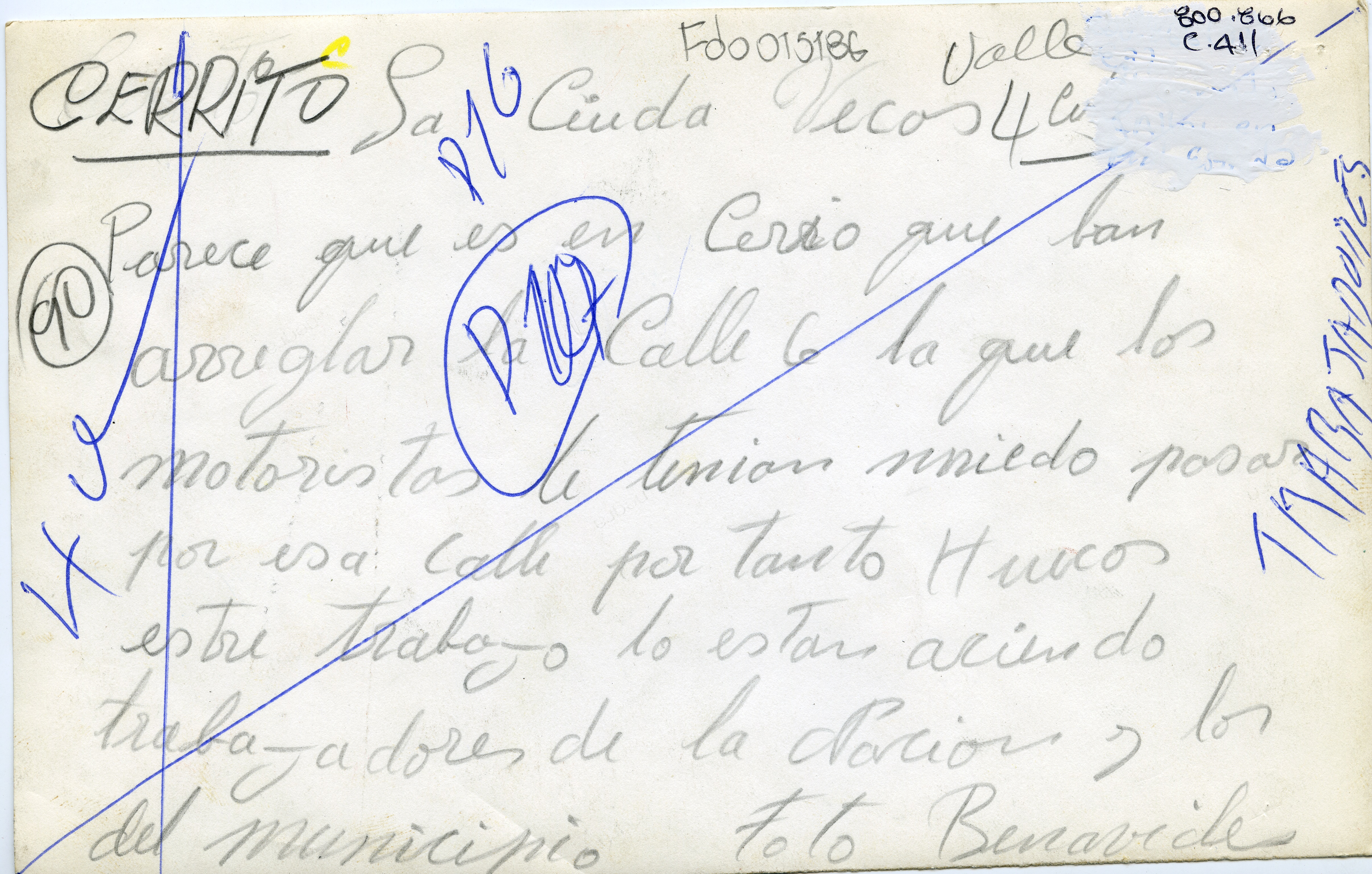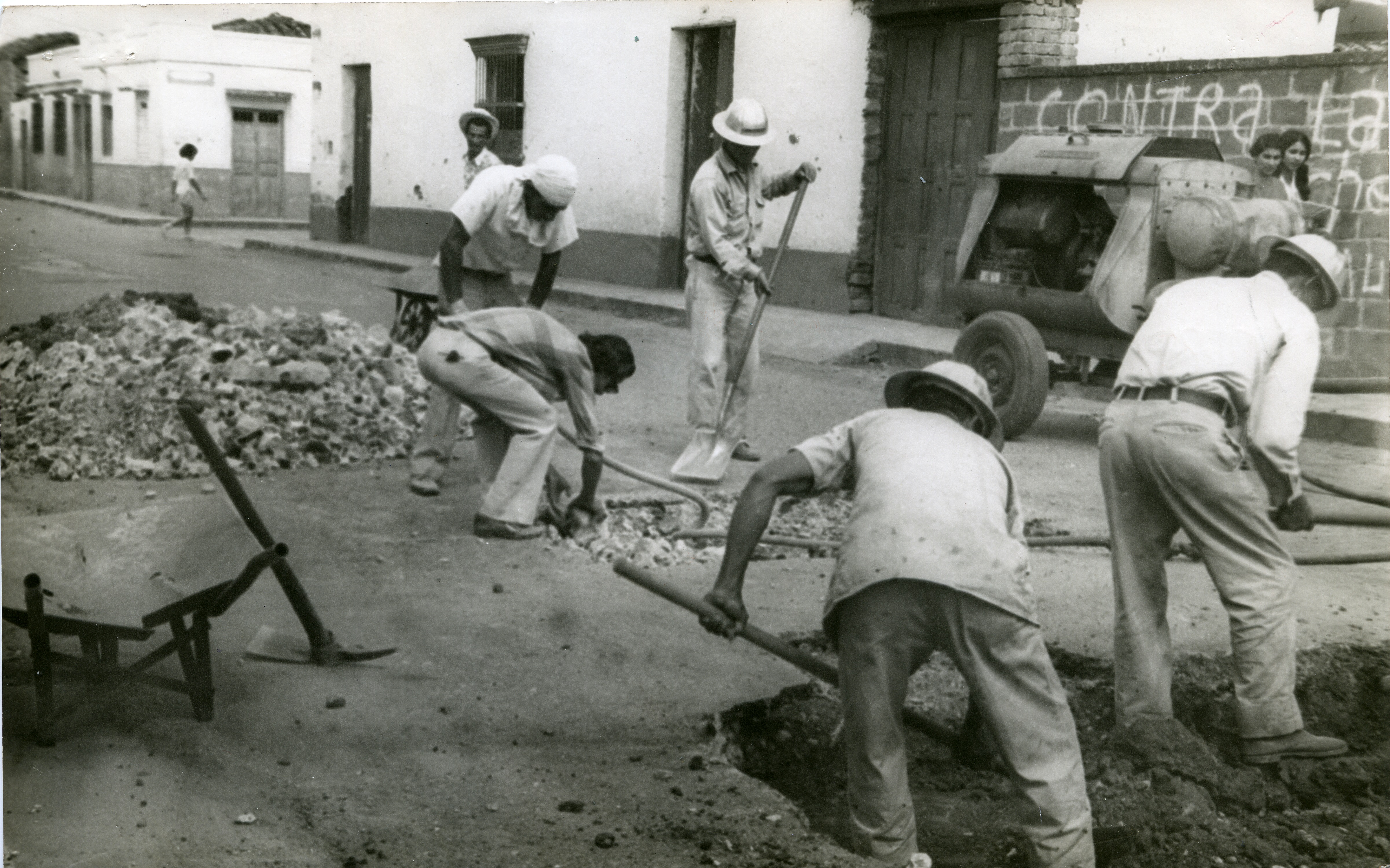 Trabajadores arreglan los huecos de la calle. Al reverso de la fotografía se anexa: "Cerrito, la ciudad, parece que en el Cerrito van ha arreglar la calle que los motoristas le tenían miedo pasar por esa calle por tanto hueco, este trabajo lo estan haciendo trabajadores de la Nación y los del Municipio".