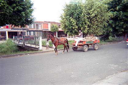 Plano general. En el medio de la imagen carretillero mirando a cámara. En primer plano calle. En el plano medio se distingue un canal recolector de aguas residuales y viviendas al otro lado de la calle.