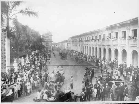 Batalla de flóres en los carnavales de la ciudad. Al costado derecho el edificio Los Portales, al fondo la torres de la catedral de San Pedro. Buga, C. 1934.