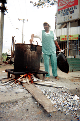 Torres Castaño, V. H. (2005). Una mujer revuelve alimentos en preparación en una olla de gran tamaño en el exterior de un restaurante. Santiago de Cali: Biblioteca Departamental Jorge Garces Borrero.
