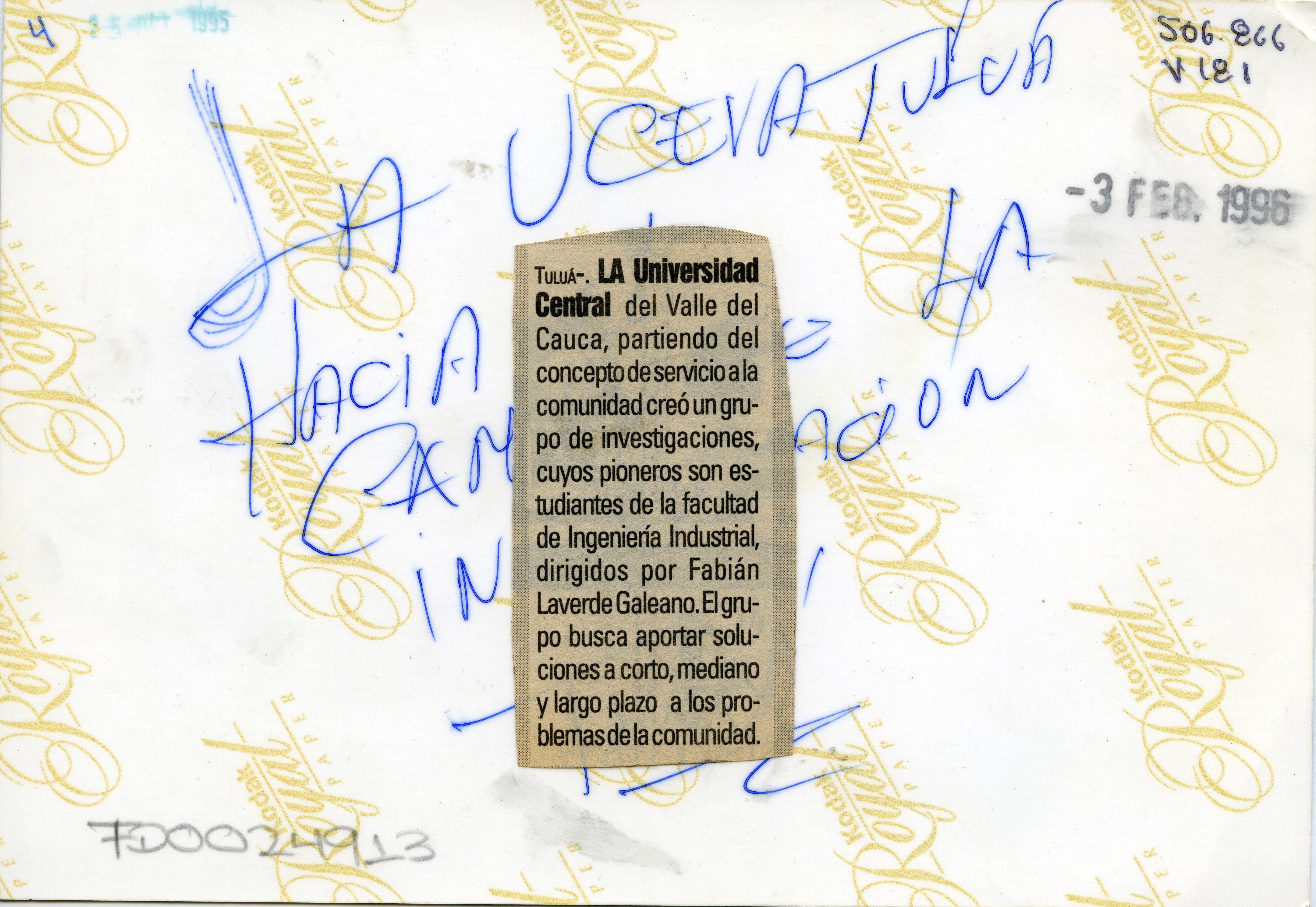 Al reverso de la fotografía se anexa recorte: Tuluá, la Universidad Central del Valle del Cauca, partiendo del concepto de servicio a la comunidad creó un grupo de investigaciones cuyos pioneros son estudiantes de la facultad de ingeniería industrial, dirigidos por Fabián Laverde Galeano. el grupo busca aportar soluciones a corto, mediano y largo plazo a los problemas de la comunidad