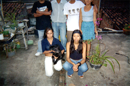 Familia del autor reunida en terraza de su edificación. Dos mujeres se encuentran arrodilladas, una de ellas sostiene un perro en sus manos. Atrás de ellas cuatro personas de las cuales no se observan sus rostros. Tejados de residencias vecinas al fondo. Plano medio.