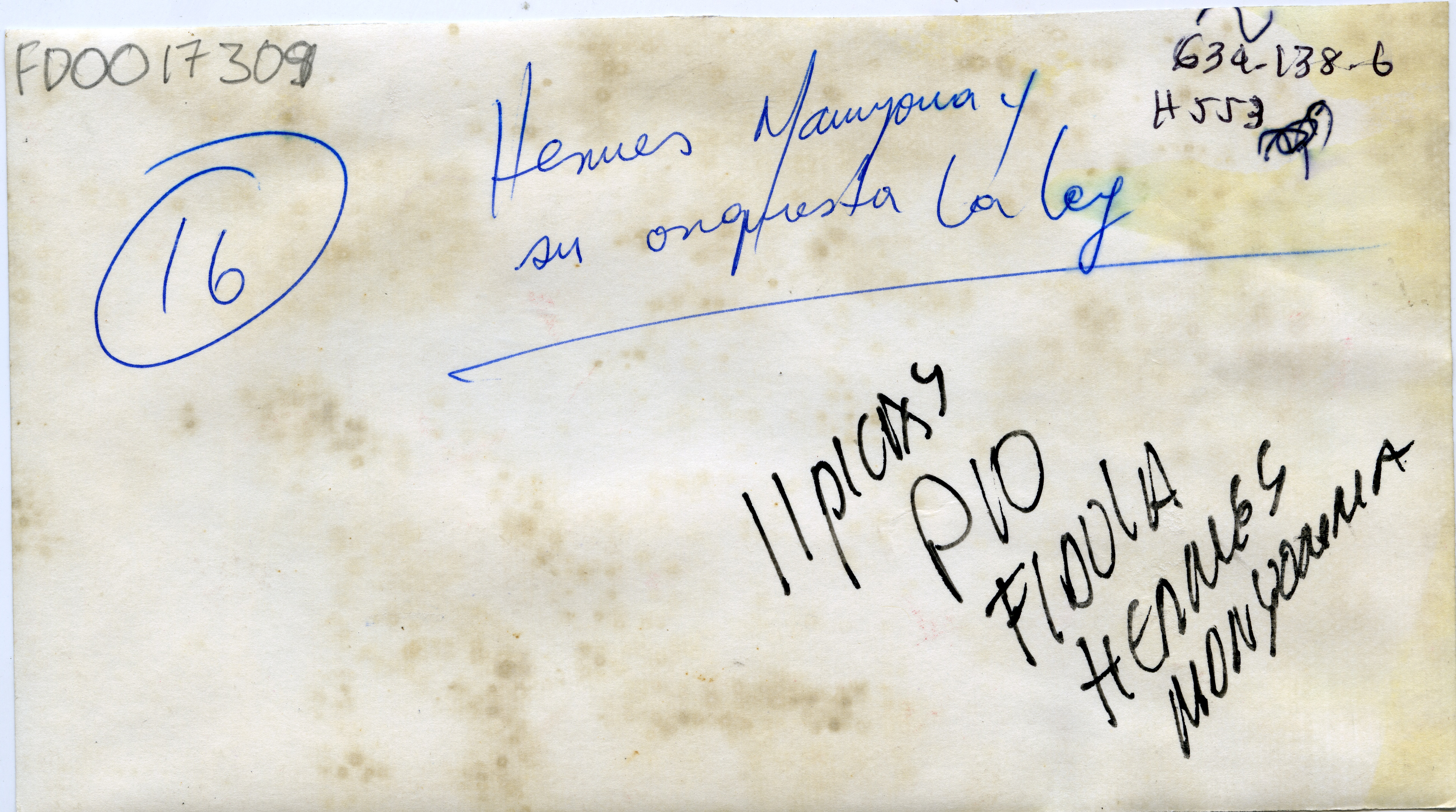 Hermes Manyoma y su La Orquesta La Ley, nacida en Cali en 1987. Se aprecia en vivo. Nota en manuscrito reverso de la foto: Hermes Manyoma su su Orquesta La Ley