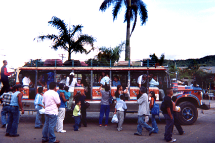 Plano abierto de "Chiva". Algunos pasajeros se apean del bus multicolor. Dos palmeras atrás del vehículo contrastan contra el cielo azul.