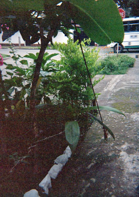 Plano medio de contexto. Exterior día. Acera con vegetación en primer plano. Parte enterior de autobus en contrapunto con señalización vial.