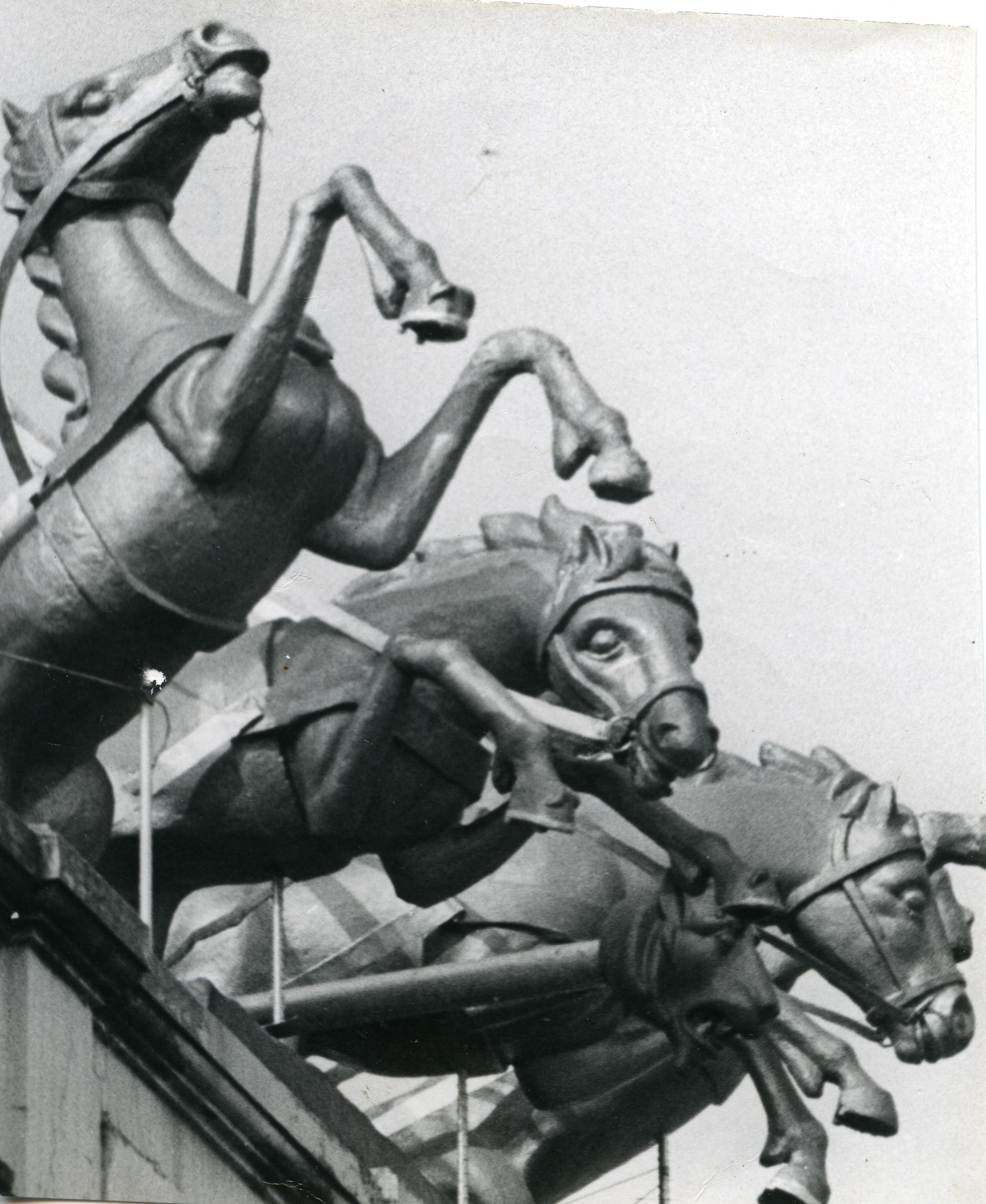 En la gráfica se aprecia: Ubicado en la Avenida Colombia con calle 4a Oeste. Es una Cuadriga Romana "carruaje alado por caballos utilizados para el combate", la cual está sobre una estructura de ferro concreto en forma de obelisco, de allí su nombre, este fue construido en el año de 1926 por el escultor Juan Fisher. Corría en Cali, la época de los años veinte cuando el concejal diputado Juan B Quintero de origen Santandereano pero radicado en Cali, decidió traer desde España al escultor Juan Fisher con el objeto que le construyera un monumento como homenaje al progreso de Cali, al que llamó La Cuadriga Romana. La escultura tenía su armazón en hierro forrado en cemento y yeso con pintura dorada, una vez terminada fue colocada en la azotea de su casa ubicada en la carrera 4a con calle 15. Con el correr del tiempo no había caleño que no identificara el lugar como la calle de los caballos. Antes de morir el señor Quintero, deseó que el monumento fuese donado a la ciudad de Cali, y fue así como sus hijos para cumplir su voluntad lo entregaron a la ciudad a través de la Sociedad de Mejoras Públicas. La cuadriga fue restaurada y ubicada en el sitio del obelisco e inaugurada el 11 de diciembre del año 1990.