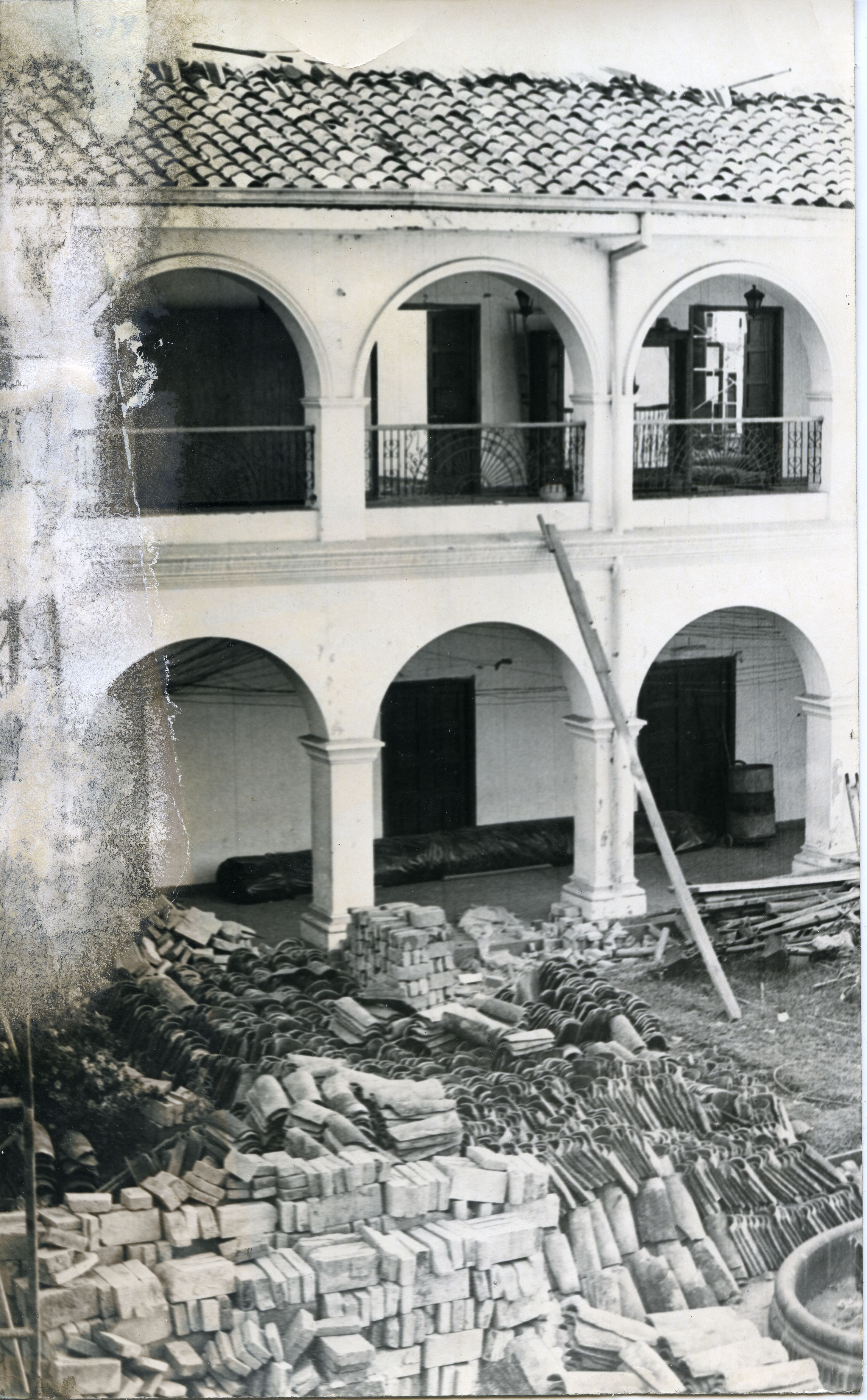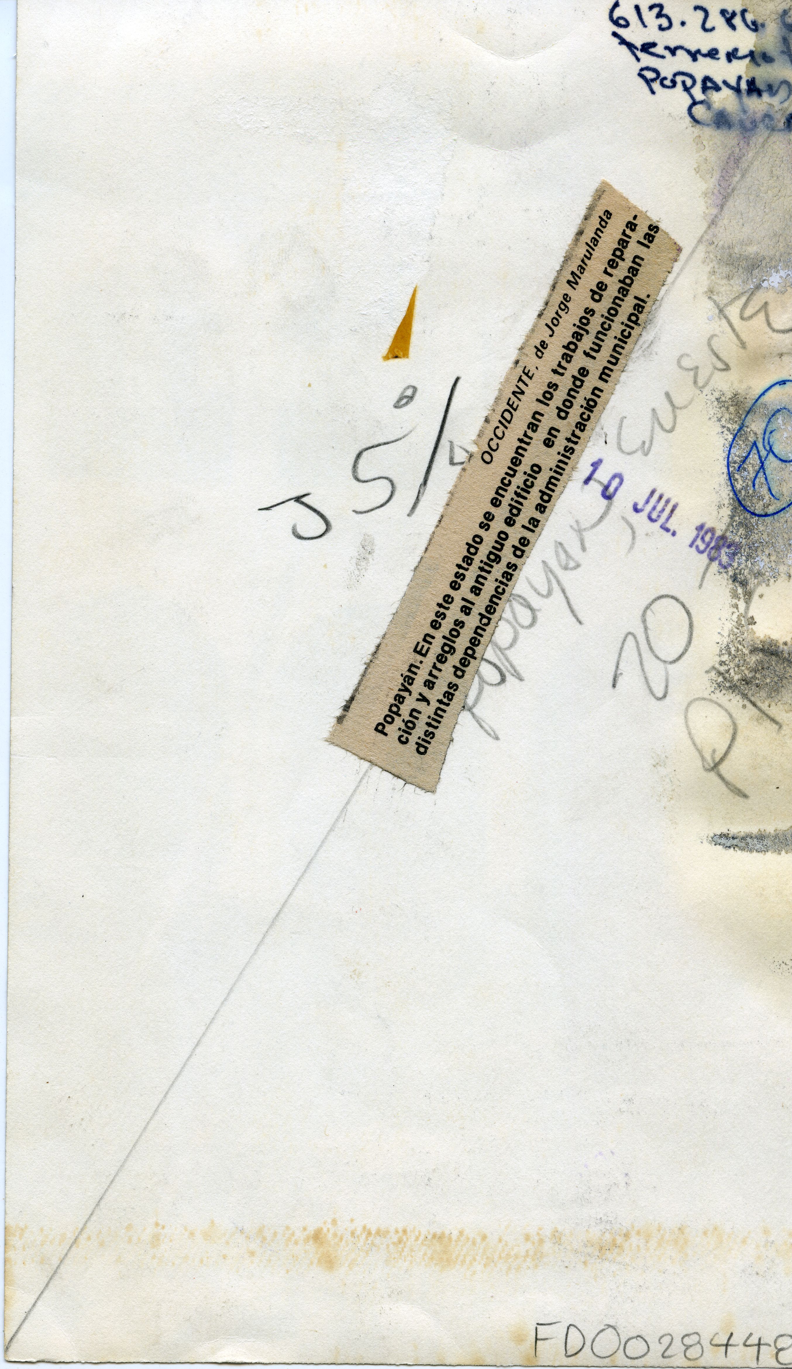 Reverso:"Popayán. En este estado se encuentran los trabajos de reparación y arreglos al antiguo edificio en donde funcionaban las distintas dependencias de la administración municipal."