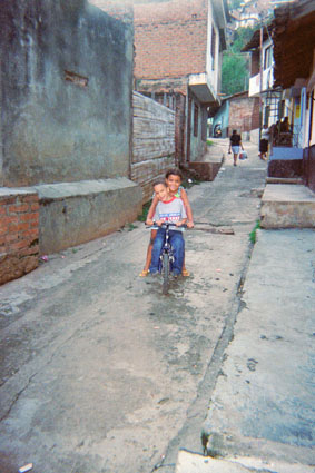 Plano general. Imagen tomada en exterior, donde se puede apreciar una vía pavimentada por la cual transitan dos niños en una bicicleta, mirando hacia la cámara. A cada lado de la vía varias viviendas.