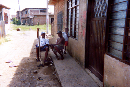 Plano general. En la imagen se puede apreciar tres jóvenes posando para la cámara. Al extremo derecho la fachada de una vivienda, con muros de ladrillo a la vista. Al fondo algunas edificaciones.