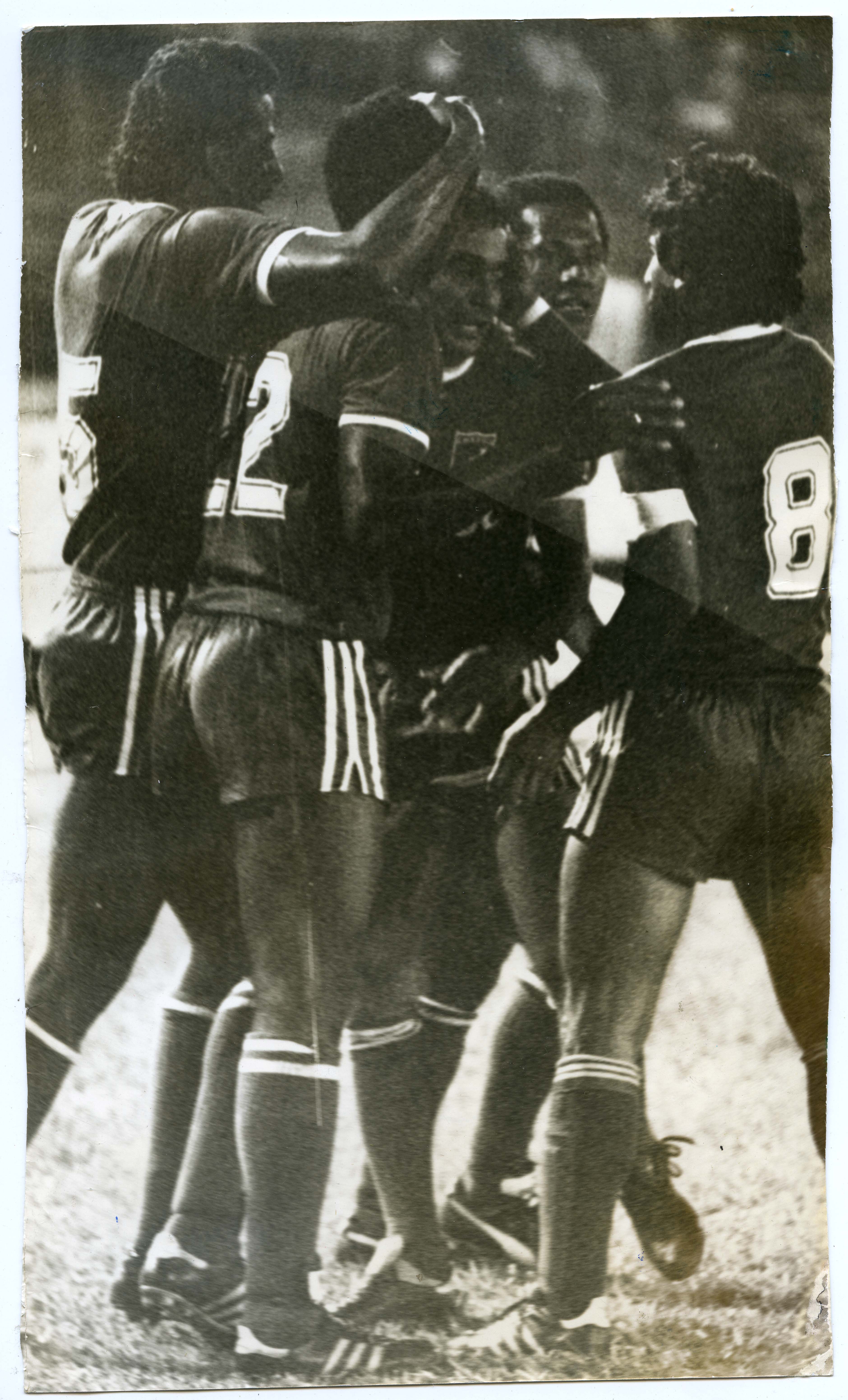 Jugadores del América de Cali celebrado un gol. Al reverso de la fotografía dice: La emoción del gol en la celebración. Todos sobre Battaglia el autor de la anotación. Un gol que puede resultar definitivo en la historia americana en esta Copa Libertadores.