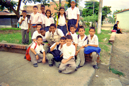 Plano Medio.  Puesta en escena de un grupo de niños y niñas, vestidos con su uniforme de colegio, sentados en un muro de un parque.  Al fondo vegetación y algunas viviendas.  Al extremo derecho una vía pavimentada y un joven sentado en un muro.