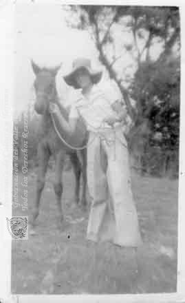 s. n. & s. n. (1950). Mujer con zamarra y pava, traje para la montura de caballos & 103313. GUACARI: Biblioteca Departamental Jorge Garces Borrero.