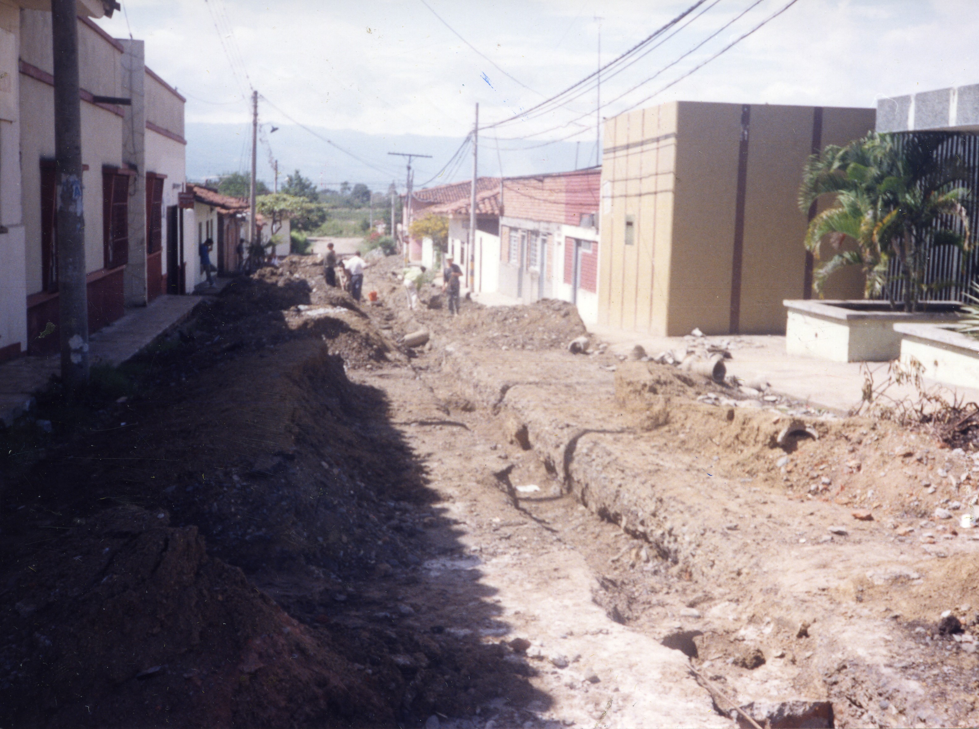 Proceso de reposición de las redes de alcantarillado en el municipio de Andalucía. Se observa la calle destapada para instalar la nueva tubería.