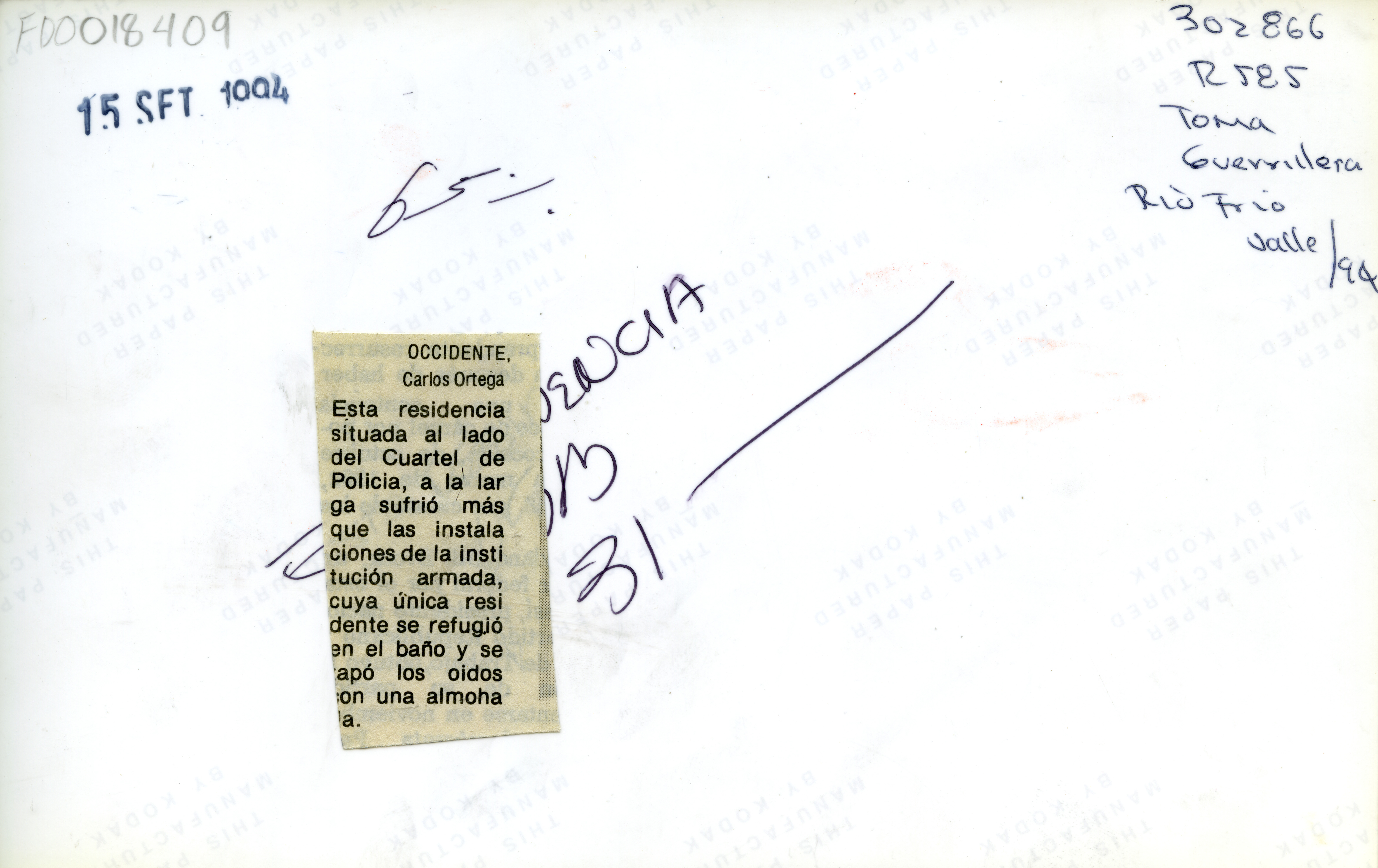 Al reverso de la fotografia se anexa recorte: "Carlos Ortega, esta residencia situada al lado del cuartel de Policia a la larga sufrio más que las instalaciones de la institución armada, cuya única residente se refugio en el baño y se tapo los oidos con una almohada