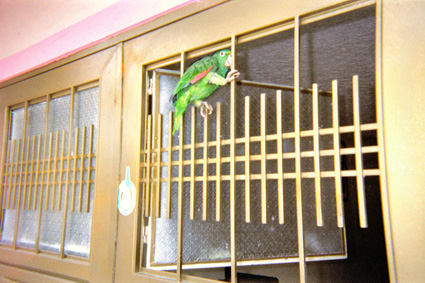 Primer plano de una puerta metálica de color café, en la que se puede apreciar un loro de plumaje verde con el borde de sus alas de color rojo