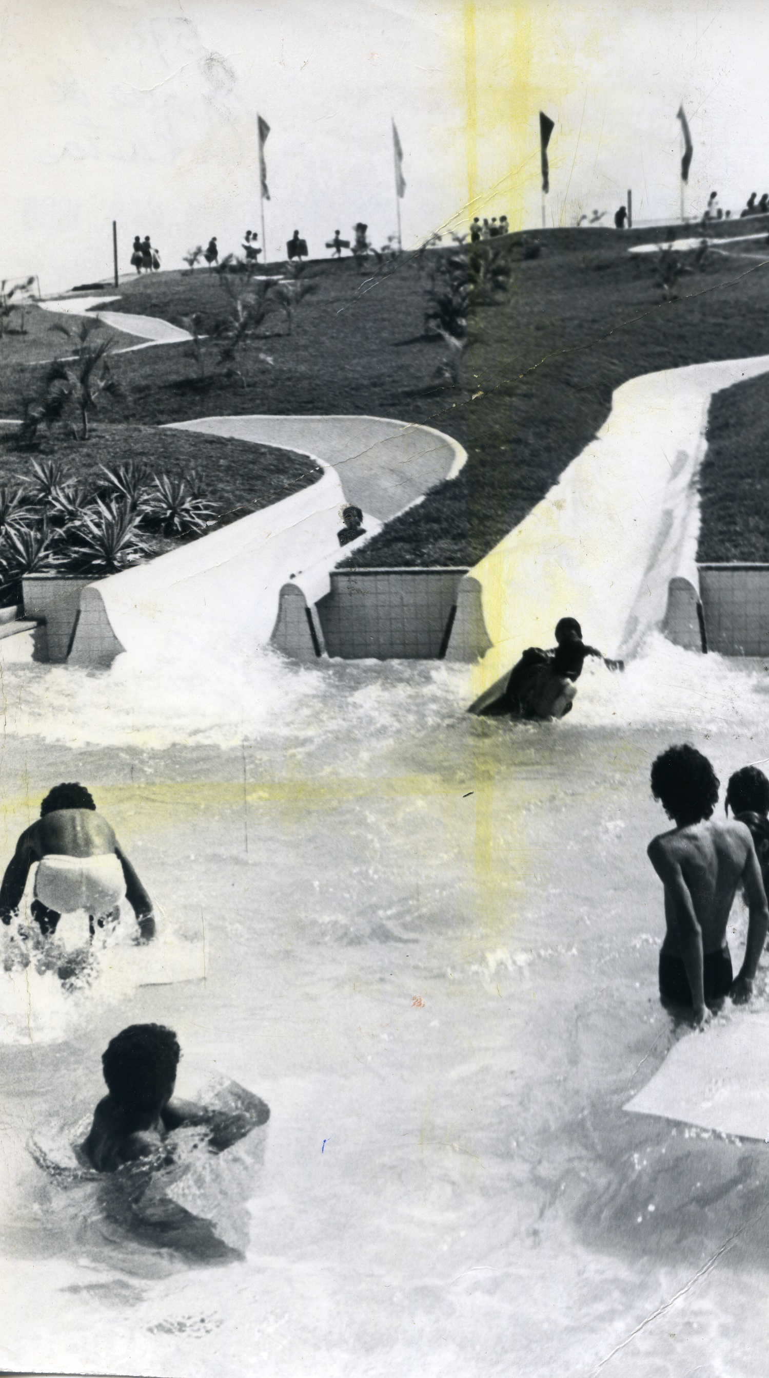 Se observan dos toboganes y la piscina; en la parte superior cuatro banderas.