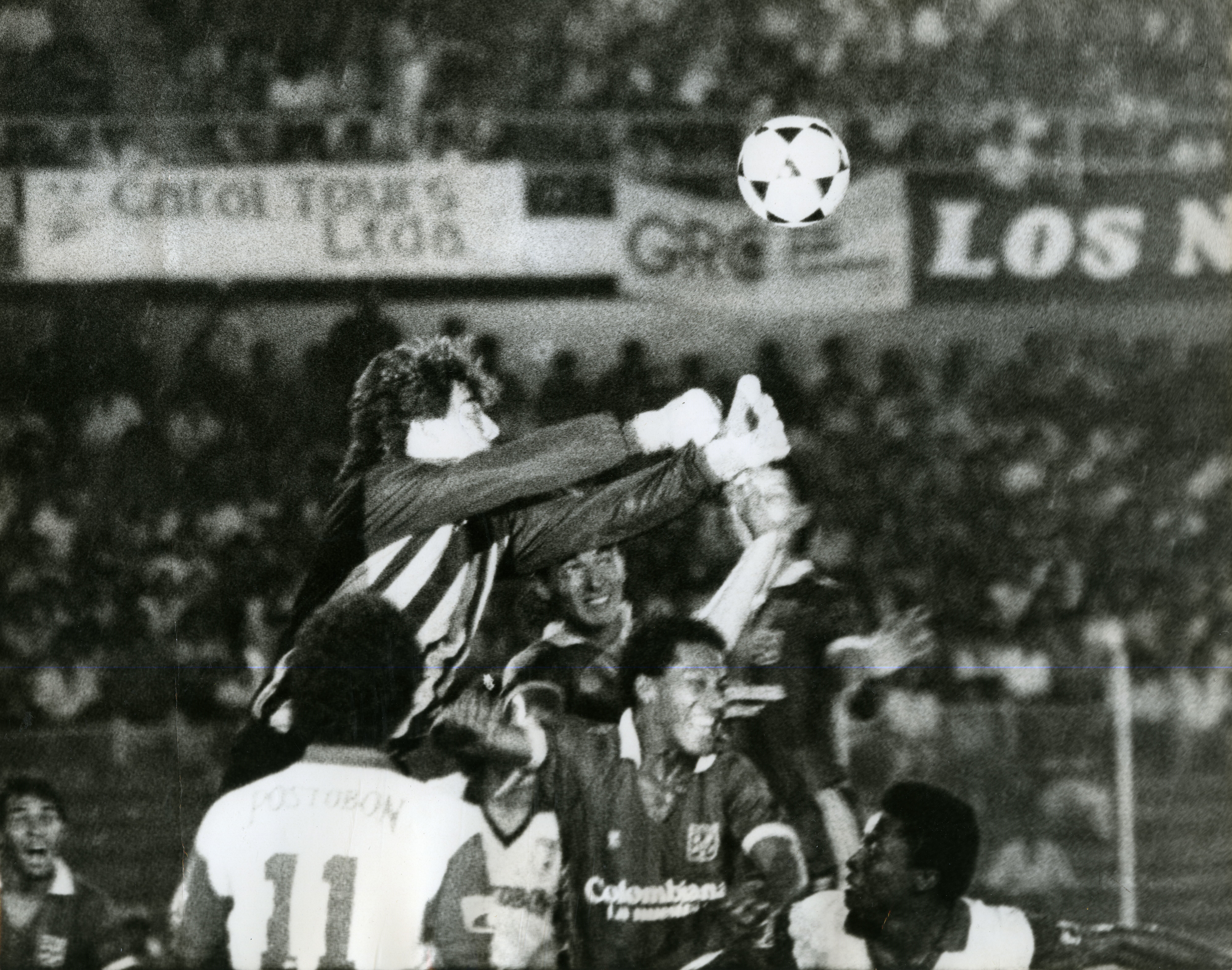 Partido entre los equipos América de Cali 0 vs Santa Fe 0, realizado en el estadio Pascual Guerrero. Se aprecia arquero Eduardo Niño rechaza balón en el área