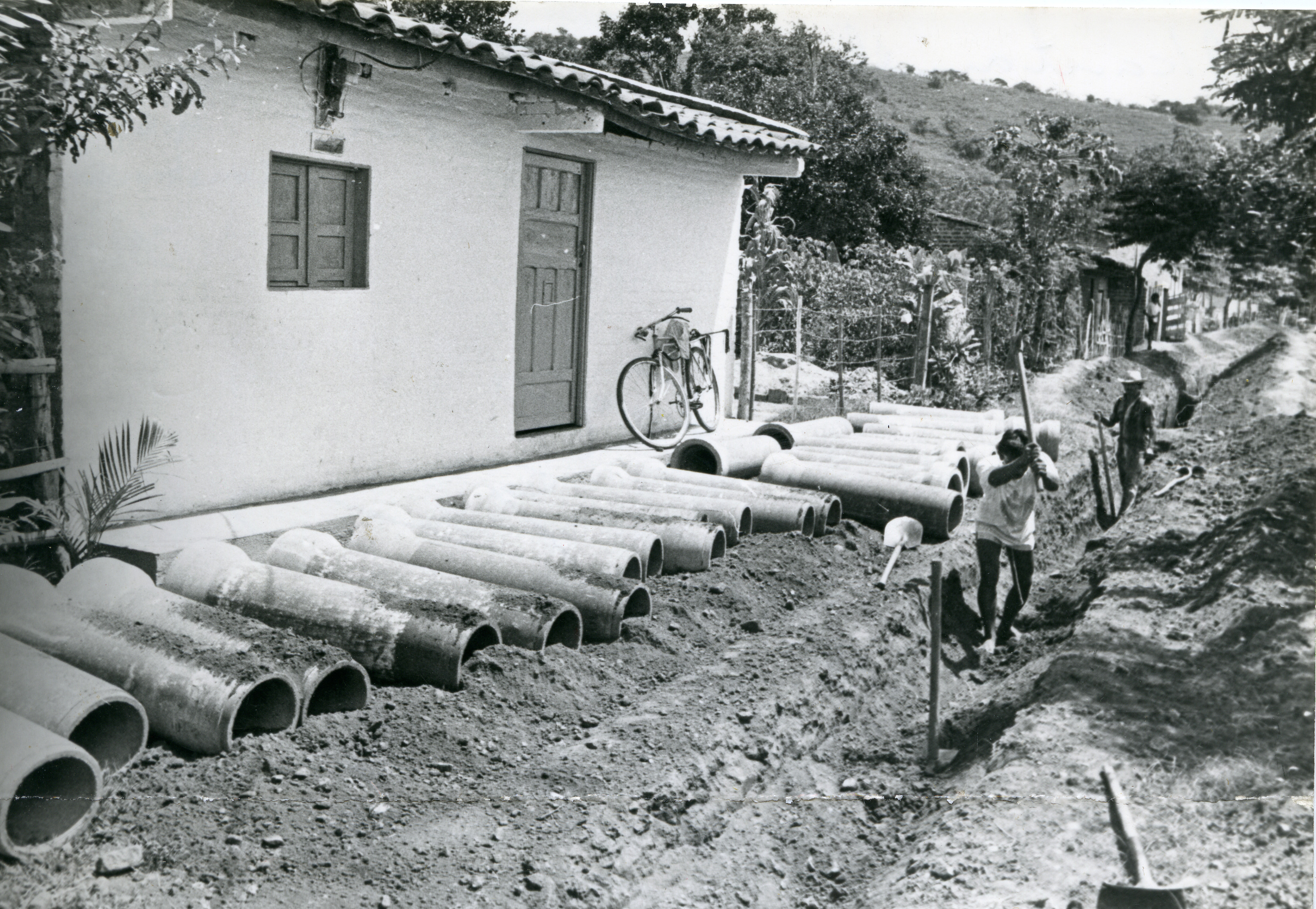 Dos hombres realizando obra púbica de alcantarillado en el corregimiento de Media Canoa del municipio de Yotoco, se observa una casa blanca y vario tubos que parecen ser de cemento.
