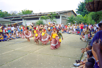 Grupo de danzas en presentación en institución educativa del barrio San judas Tadeo