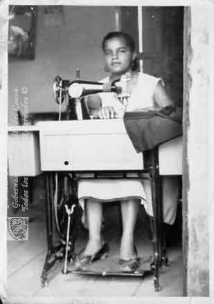 Martha Soto, cosiendo en su máquina Singer de pedal. Dagua. C. 1937.
