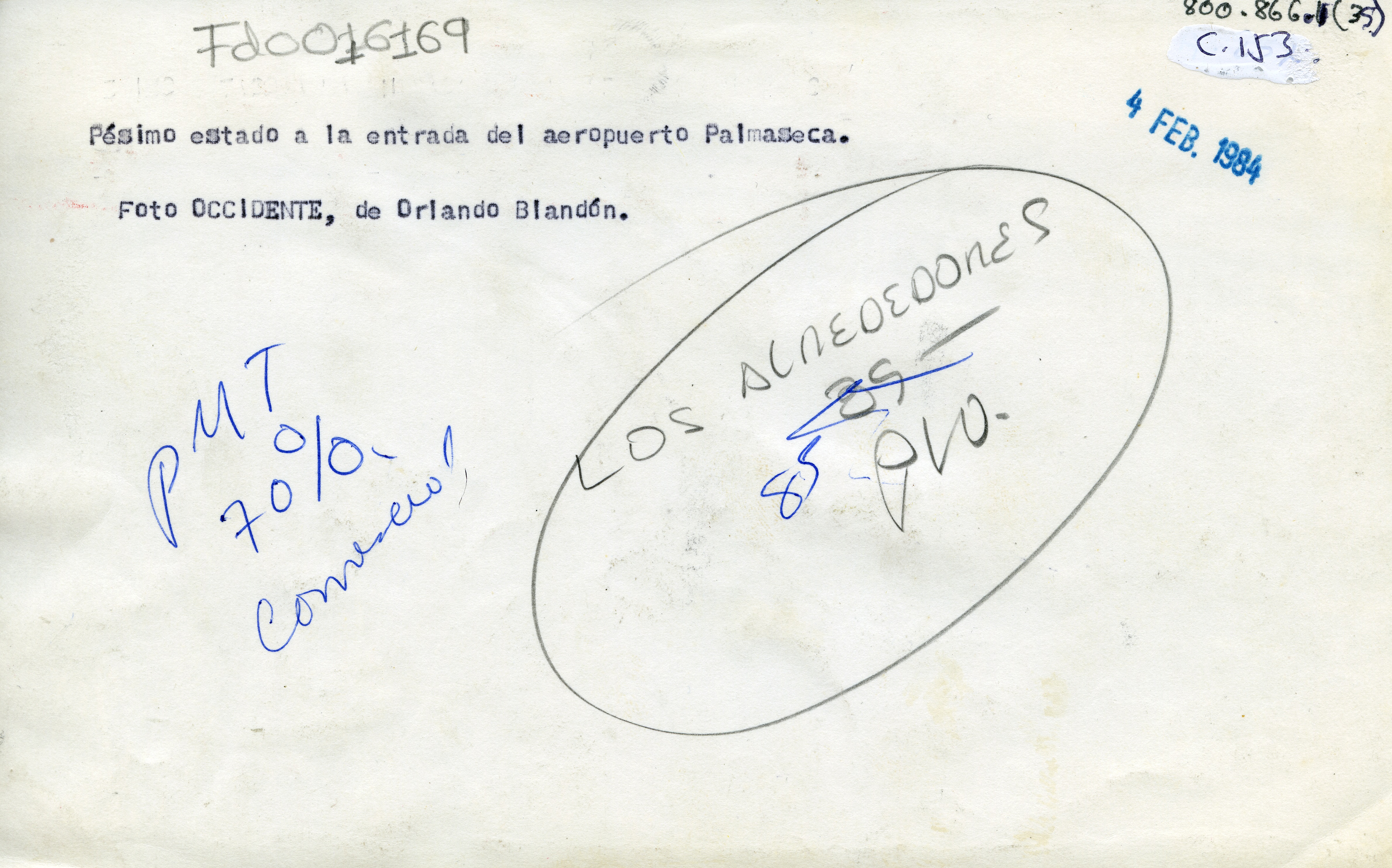 Al reverso de la fotografía dice "Pésimo estado a la entrada del aeropuerto Palmaseca"