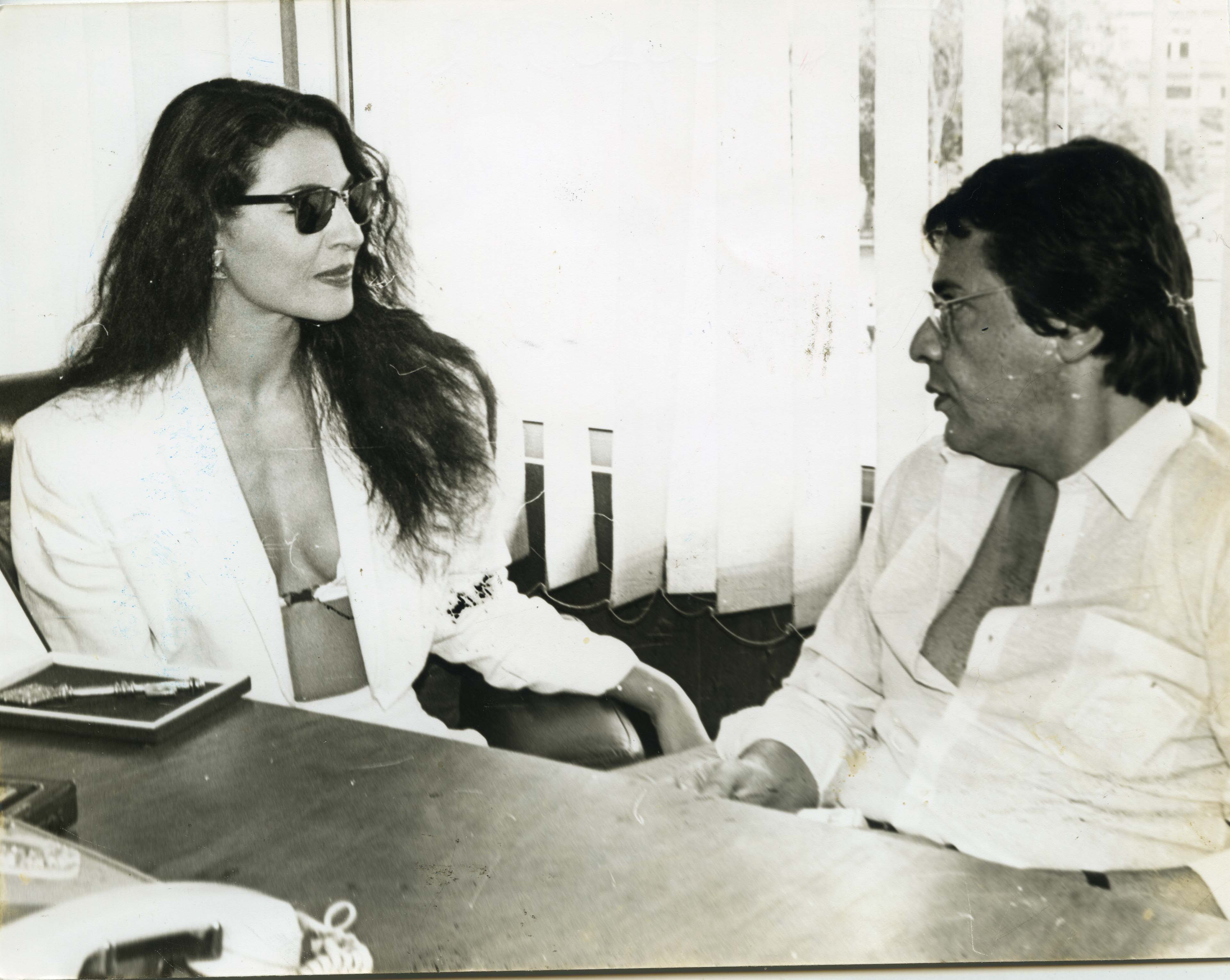 En el pie de foto dice lo siguiente: el alcalde de Cali, Carlos Holmes Trujillo García, trata de concentrarse en la charla que sostiene con la actriz Amparo Grisales, cuando ella lo visito a su despacho, con un atrevido atuendo que insinúa “Los pecados de Inés de Hinojosa” y dejaba ver partes de sus atributos y toda su coquetería
