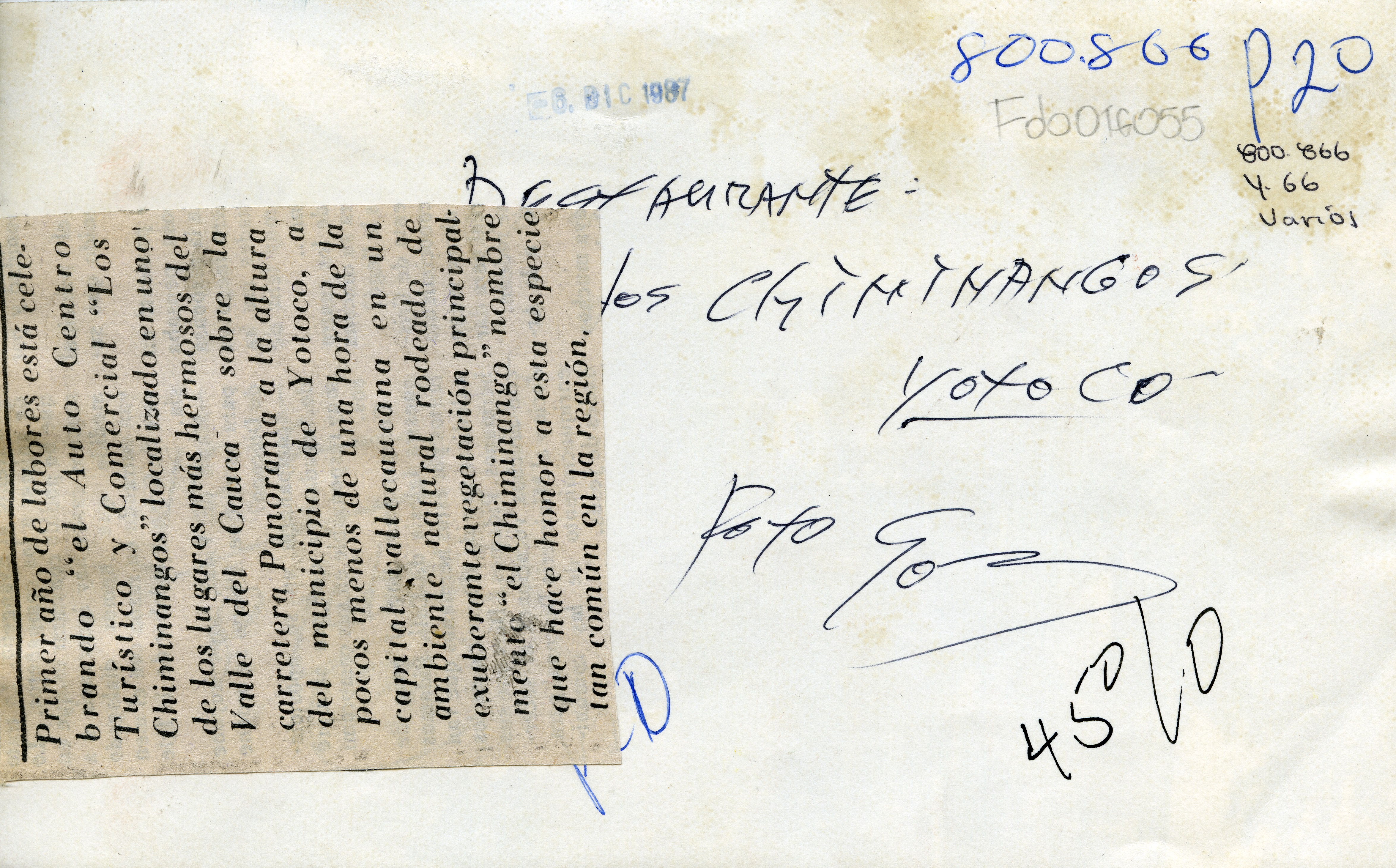 Al reverso de la fotografía se anexa un recorte que dice " Primer año de labores está celebrando "el Auto Centro Turístico y Comercial " Los Chiminangos" localizado en uno de los lugares más hermosos del Valle del Cauca sobre la carretera Panorama a la altura del municipio de Yotoco, a poco menos de una hora de la capital vallecaucana en un ambiente natural rodeado de exuberante vegetación principalmente "el Chiminango" nombre que hace honor a esta especia tan común en la región,"