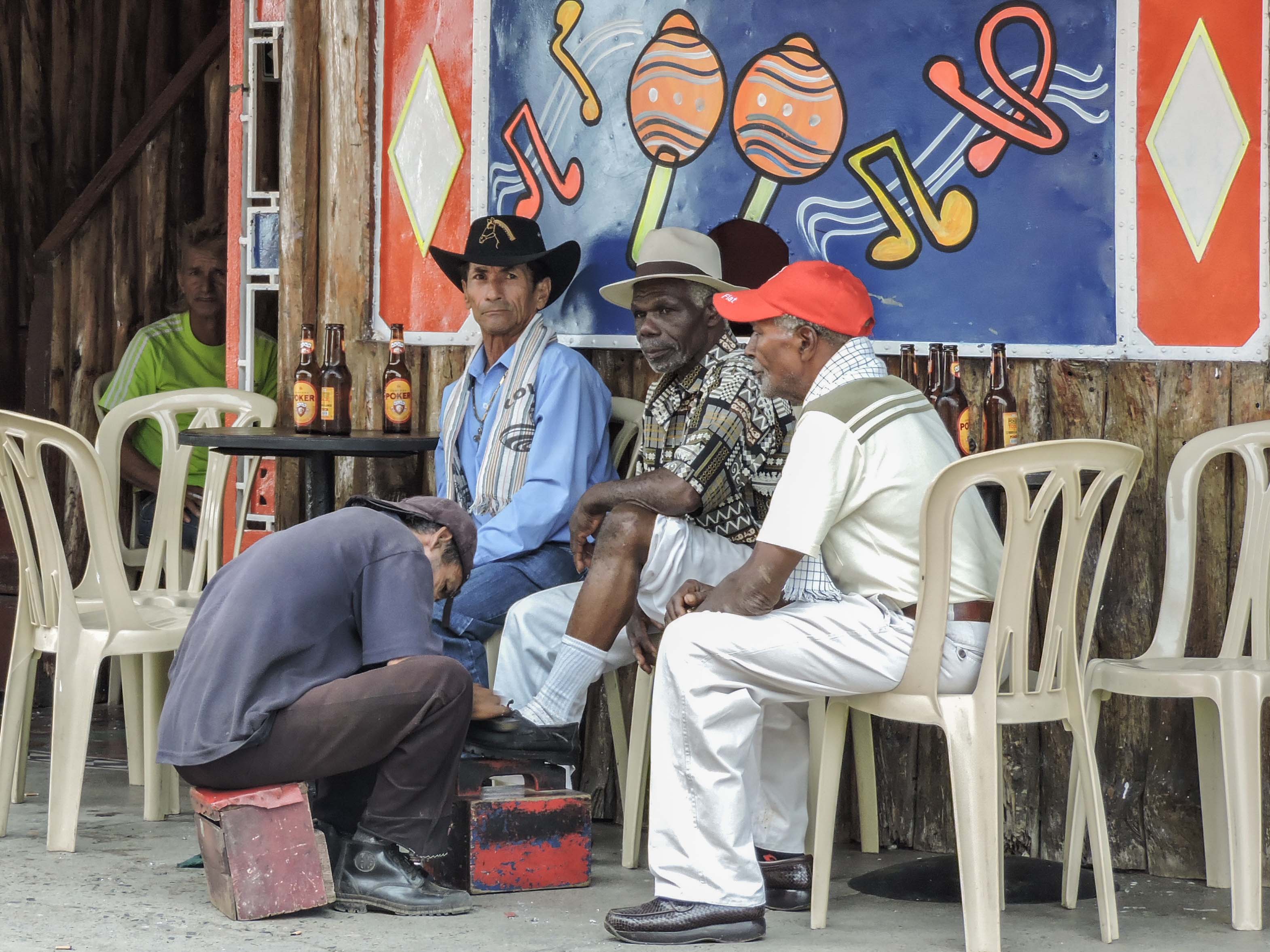 El Águila, Valle del Cauca. Fundado en 1899, por Emelecio Duque, Marcelino Echeverri y los hermanos Bernardo y Natalio Serna. Municipio desde 1947. Economía importante en agricultura, caficultura, ganadería, minería, explotación forestal, etc. Observamos en la imagen, un hombre en su trabajo de lustrar zapatos, en compañía de tres clientes